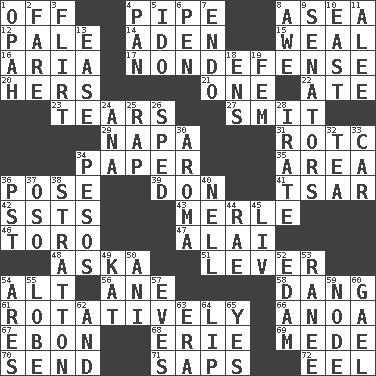 ACROSS 1. Not in operation 4. Corncob 8. At sea 12. Light colored 14. An important port of Yemen 15. Welt 16. Operatic vocal solo 17. Unrelated to defense, as in spending 20. Possessive pronoun 21. Single 22. Had dinner 23. Pulls into pieces 27. Stricken, poetically 29. California wine valley 31. College mil. group 34. Some stationery 35. Length times width 36. Introduce or present, as a question 39. Spanish title 41. Russian ruler of old 42. Fast planes 43. Haggard of country music 46. "Corrida" creature 47. Jai _ 48. "____ silly question..." 51. Crowbar 54. The first octave above the treble staff 56. One (Scot) 58. Mild oath, euphamism for damn 61. Rotating or pertaining to rotation 66. Small Philippine buffalo 67. Inky black, to poets 68. One of the Great Lakes 69. Ancient Persian 70. Post 71. Plant excrements 72. Snakelike fish DOWN 1. Brightly colored fish 2. Conductor's collection 3. Talk or behave amorously 4. Baking dish 5. Wedding promise 6. Writing instrument 7. Inside; within (prefix) 8. Deep reverence 9. Elected representatives 10. 90 degrees 11. Toward shelter 13. Relaxation 18. Followers of ems 19. Opposite of masc. 24. Santa ___, CA 25. Reproach for some lapse or misdeed 26. Broke a traffic law 28. Feeling or showing extreme anger 30. Scent 32. Afternoon social gathering 33. Auto 34. Mexican monetary units 36. Pacific Standard Time (abbr.) 37. Bear (Spanish) 38. Ski resort town in Vermont 40. 1994 drama film starring Jodie Foster 44. Actress Charlotte 45. 54 in ancient Rome 49. Krazy ___ of comics 50. Cuckoo 52. Dutch treat 53. Indian princess (variant) 54. Ancient Greek god of war 55. Ear part 57. Nights before holidays 59. Thickened enlargement 60. Highlander 62. Plus 63. Epoch 64. Mouth edge 65. Consenting reply