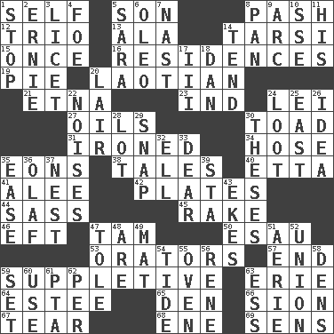 ACROSS 1. Oneself 5. Male offspring 8. Romantic infatuation 12. Musical group of three 13. Insect wing 14. Tarsus (plural) 15. Single time 16. Dwellings 19. Sliced dessert 20. Of or relating to Laos or its people 21. Inactive volcano in Sicily 23. Working for oneself (abbr.) 24. Flowery wreath 27. Lubricates 30. Frog relative 31. Pressed 34. Flexible conduit 35. Immeasurably long periods of time 38. Lies 40. Singer James 41. Toward shelter 42. Food holders 44. Backtalk 45. Immoral or dissolute person 46. Bank Draft (abbr.) 47. Scottish cap 50. He sold his birthright 53. Speakers 57. Conclusion 59. Supplying deficiencies 63. 4th largest of the Great Lakes 64. First name in cosmetics 65. Lair 66. The Jewish people; Israel 67. Rend 68. Compass dir. 69. Elected reps. DOWN 1. Constrict 2. Bert's buddy 3. It is permitted: Lat. 4. Enemy 5. "Two Mules for Sister ____" 6. Margarine 7. Political cartoonist Thomas 8. Baking dish 9. Curve 10. Compass dir. 11. Part of HMS, perhaps 14. Be inclined (to) 17. One more than two 18. One of the 12 tribes of Israel 20. Den 22. Annoying sounds 24. Plunder 25. 90 degrees 26. The main thing one is thinking about 28. Car dealer's back yard 29. Fastener 30. College papers 32. Pipe bend 33. Letter starter 35. Relaxation 36. Norwegian king 37. A home for chicks 39. R.R. building 43. Makes supply last 47. Lacquered or enameled metalware 48. "We ___ not amused" (Victoria) 49. Floor protector 51. Nest on high 52. The state of being joined or united 54. Event that recurs at intervals 55. Baking chamber 56. French philosopher Descartes 58. Hiding places for outlaws 59. Put into a specified state 60. Purpose 61. Parent Teacher Association (abbr.) 62. For each 63. Curvy letter