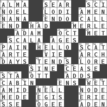 ACROSS 1. _ mater 5. Dry up 9. _-fi 12. Christmas carol 13. Farming town in central California 14. So be it 15. Nanny 16. Inside; within (prefix) 17. Give a ring to 18. Conclusion 19. Possessed 21. Haggard of country music 22. First man 24. Sep. follower 26. Was introduced to 27. Any of the three canals of the cochlea 28. Matures 29. Ache 30. Phone greeting 32. Get outta here! 36. Johnson of "Laugh-In" 37. Compete 38. Bowlike part 39. 24-hour periods 40. Is inclined (to) 42. Old wives' tales, e.g. 43. Trig term 44. Stop 46. R.R. building 49. Baseball player Mel 50. Sums up 51. Small house or cottage 53. Followers of ems 54. Dripping 57. Among 58. 1994 drama film starring Jodie Foster 61. Connecting point 62. Ancient Persian 63. The front part of a cuirass 64. 4th largest of the Great Lakes 65. Compass dir. 66. Double curve, resembling the letter S 67. Arabian gulf DOWN 1. Singer Murray 2. Grant temporary use of 3. Ananias' fault 4. According to 5. Downhill vehicle 6. A really long time 7. Say or write further 8. _ de Janeiro 9. Excessive but superficial compliments 10. Cell (Danish) 11. An arm off of a larger body of water 14. Adept person 19. Actor Linden 20. Nanny 21. Mountains (abbr.) 23. Natives or inhabitants of Denmark 24. Stared at amorously 25. Corporate head (abbr.) 27. "Two Mules for Sister ____" 28. Place in a line 29. Groovy apt. 31. Happening 32. Vegetable dish 33. What you're doing now 34. Land measure 35. Definite Article 40. Teat (slang) 41. Examine hastily 43. Boy, to dad 45. Begley and Asner 46. Fraudulent business schemes 47. Softens 48. Remain 52. Binary compound 53. Otherwise 55. Singer Brickell 56. Adolescent 58. Modern: prefix 59. Ovum 60. Whopper 61. Teachers' org.