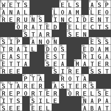 ACROSS 1. Moistens 5. Raised railways 8. Viper 11. Of or related to the anus 12. Rich soil 13. Lion 14. Summer TV shows 17. Happening 19. Spoke pompously 21. Opts 22. Play the lead 23. Elected rep. 24. Small drink 27. Soon (poet.) 29. Curvy letter 32. Lag or linger behind 34. Two (Sp.) 36. Dutch treat 37. 90 degrees 38. Eastern Standard Time (abbr.) 39. Port city in Latvia 40. Singer James 41. Ocean 42. Mother 43. To separate or throw off 44. Father 46. Fast jet (abbr.) 47. Parent Teacher Assoc. 50. Roll call or roster of names 52. A viewer who gazes fixedly 55. Michaelmas daisies 57. News announcer 59. Threatening words 62. It is 63. Drop; flow; fall 64. California wine valley 65. Observe 66. Snakelike fish 67. Blind as ____ DOWN 1. Armed conflict 2. Compass dir. 3. Pacific island yam 4. Disparaging remarks 5. A really long time 6. Shoestrings 7. Grin 8. Actor Baldwin 9. Posted 10. Plant holders 12. Hat (slang) 15. Relating to or accompanying birth 16. Comedian Laurel of Laurel & Hardy 18. Lair 20. Eats (away) 24. Navigate 25. Feeling or showing extreme anger 26. Thick mixture 28. Olfactory organs 29. Proofreads 30. Gurus 31. Don Adams' spy role 33. Call ___ day 35. Flight of steps 36. Epoch 42. Distance measurement 45. Printing process, for short 47. Adept person 48. Laconic 49. Nick name for Arthur 51. Sports stadium 52. Indian titles of respect 53. Wig 54. Domed church section 55. "We ___ not amused" (Victoria) 56. Broad, flat, thick piece 58. Pipe bend 60. Health resort 61. Erode