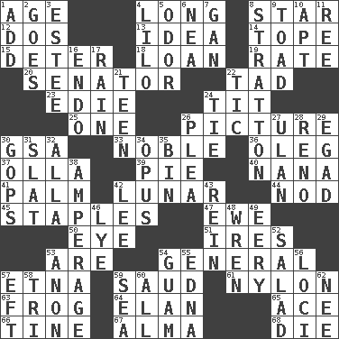ACROSS 1. Mature 4. Having great length 8. Play the lead 12. Two (Sp.) 13. It may be bright or harebrained 14. Drink excessively 15. Prevent from occurring 18. Grant temporary use of 19. Pace 20. Legislator 22. Bit 23. Singer Brickell 24. Teat (slang) 25. Single 26. Photo 30. Girls' org. (abbr.) 33. Having high moral qualities 36. Cassini of fashion 37. Rounded earthenware pot or jar 39. Sliced dessert 40. Grandmother 41. Inside of hand 42. Type of eclipse 44. Dreamland 45. Paper fasteners 47. She-sheep 50. Sight organ 51. Angers 53. "We ___ not amused" (Victoria) 54. Commissioned military rank 57. Inactive volcano in Sicily 59. Saudi Arabian king (1953-1964) 61. High-strength synthetic material 63. Tree-dwelling hopper 64. Enthusiasm 65. Adept person 66. Prong on a fork 67. _ mater 68. Expire DOWN 1. Say or write further 2. Leaves 3. First name in cosmetics 4. _ and Stitch 5. Scent 6. Teachers' org. 7. Separate the seeds from cotton 8. Ski resort town in Vermont 9. Frog relative 10. Fitting 11. To riddle 16. Inside; within (prefix) 17. Water falling in drops from the sky 21. Adolescent 22. Nervous spasm 24. Neckwear 26. Entreaty 27. ____ Bator 28. Western Nevada city 29. Mild oath 30. Republicans 31. Narrow board 32. Silent film actress Nazimova 34. Musical composition 35. Storage container 38. Electrical Measurement 42. Area sheltered from the wind 43. It's straight from the horse's mouth 46. Potassium hydroxide 48. Songbird 49. Suggestive of the supernatural 52. Vegetable dish 53. Soon (poet.) 54. Island territory of the United States 55. Pulitzer Prize-winning author Ferber 56. Venues 57. Newt 58. Three (prefix) 59. Ocean 60. Everything 62. Born