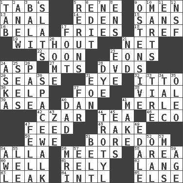 ACROSS 1. Bar bills 5. French philosopher Descartes 9. Presage 13. Of or related to the anus 14. Genesis locale 15. Without 16. Actor Lugosi 17. Strips of potato fried in deep fat 18. Unclean, religiously 19. Sans 21. Remaining after all deductions 22. Within a short period 23. Immeasurably long periods of time 24. Cleo's killer 27. Mountains (abbr.) 28. Movie discs 29. Gospel singer Marvin 31. Sight organ 32. "Tell ____ the Marines!" 36. Seaweed 37. Enemy 38. Small bottle 39. At sea 40. Daniel's nick name 41. Haggard of country music 42. Russian ruler of old 44. Afternoon social gathering 46. Environmental prefix 47. Nourish 48. Immoral or dissolute person 50. She-sheep 51. Mood resulting from idleness 54. Silent film actress Nazimova 56. Confronts 58. Type of rug 60. Not ill 61. Trust 62. Long (Scottish) 63. Path through which fluid escapes 64. International (abbr.) 65. Otherwise DOWN 1. Bar bill 2. Afresh 3. Indonesian resort city 4. Narrow boards 5. Summer TV shows 6. Prepare for publication 7. Born 8. Followers of ems 9. Clearly or manifestly demonstrative 10. Shops 11. Compass dir. 12. Overdraft (abbr.) 17. One third of a yard 20. Dwelling 21. Lower and raise head in agreement 23. Night before a holiday 24. "____ silly question..." 25. Perceives with the eye 26. Light colored 28. Color 30. High altitude stroll 31. A really long time 33. Become fatigued 34. Baby powder 35. Margarine 37. At a great distance 40. June honoree 41. Cause to be 43. Last letter of the English alphabet 44. TNT 45. Hearing organs 47. Chap (slang) 49. Peak District village in England 51. Waist strap 52. Taken by mouth 53. Not women's 54. Leather borer 55. Area sheltered from the wind 56. Medical imaging device (abbr.) 57. Car or cant ending 59. Mature