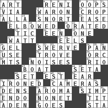 ACROSS 1. Tate display 4. Painter Guido (1575-1642) 8. I made a mistake 12. By way of 13. Make _____ (do battle with) 14. Riding implement 15. Silent film actress Nazimova 17. Derisive sound 18. Comfort 19. Turned at an angle; bent 21. Spoke pompously 23. Nervous spasm 24. Car or cant ending 26. Single 27. Electrical Unit 28. Snakelike fish 30. Set 31. Turn aside suddenly 34. Baking dish 37. Purpose 38. Collection of objects 39. The grampus (Milton) 40. Mountains (abbr.) 41. Annoying sounds 42. River (Sp.) 43. Water vessel 44. Stalk of a moss capsule 46. Put into a specified state 47. Eastern Standard Time (abbr.) 50. Hearing organ 51. Pressed 54. Devices for capturing images 57. Lairs 58. Scent 60. Simple or foolish person 62. Inside; within (prefix) 63. Music written for nine 64. Teat (slang) 65. An important port of Yemen 66. Leaves 67. R.R. building DOWN 1. Actress Gardner 2. Cause heat under the collar 3. Baron Munchausen's specialties 4. Indian princess (variant) 5. Wear away 6. And not 7. To the inside or interior of 8. Seas 9. Declaim 10. Introduce or present, as a question 11. Hurried 13. Compass dir. 16. "This won't hurt ____!" 20. Sep. follower 22. Hero or heavy, e.g. 25. Impudent aggressiveness 27. Compass direction 29. Nights before holidays 30. Chewing product 31. Portico 32. Compose 33. Greek goddess of the dawn 34. Likenesses of persons 35. Roberta Peters solo 36. Non-commissioned officer (abbr.) 41. Short letter 43. Gillaume's butler role 44. Perceive with the eye 45. Hearing organs 46. Something which is sent 48. Biscuitlike quick bread 49. Softens 51. It may be bright or harebrained 52. Tear apart 53. Mild oath, euphamism for damn 55. Floor covering 56. Stricken, poetically 59. Friend of Pooh 61. Parent Teacher Assoc.