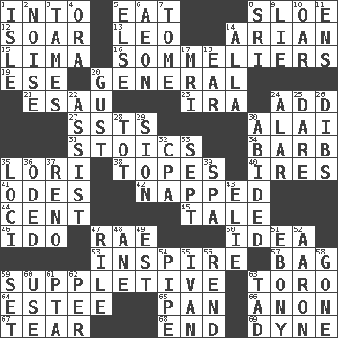 ACROSS 1. To the inside or interior of 5. Ingest 8. _ gin 12. Fly high 13. Lion 14. Believer in; advocate of (suffix) 15. Pale green bean 16. Wine waiters 19. Compass dir. 20. Commissioned military rank 21. Son of Isaac 23. Retirement account (abbr.) 24. Say or write further 27. Fast planes 30. Jai _ 31. Unemotional ones 34. Sharp remark 35. Australian parrot (variant) 38. Drinks excessively 40. Angers 41. Lyric poems 42. Slept 44. Penny 45. Falsehood 46. Wedding promise 47. Actress Charlotte 50. The main thing one is thinking about 53. Motivate 57. Container for groceries 59. Supplying deficiencies 63. "Corrida" creature 64. First name in cosmetics 65. Baking dish 66. Soon (poet.) 67. Pull apart 68. Conclude 69. Centimeter-gram-second unit of force DOWN 1. Capri or Wight 2. Annoying sound 3. Corrects by punishment or discipline 4. Mouth or opening 5. Otherwise 6. A really long time 7. Heavy book 8. Indian title of respect (Mr.) 9. Untruth 10. Rowing implement 11. Followers of ems 14. Silent film actress Nazimova 17. Medical imaging device (abbr.) 18. Ewer handle 20. Abrupt rush of wind 22. Help 24. Having or resembling wings 25. Have the gumption 26. Claim 28. Small child 29. The Jewish people; Israel 30. Remained 32. Numbers guy (abbr.) 33. Back-to-school mo. 35. Event scenes 36. Wrote a lyric poem 37. Western Nevada city 39. Health resort 43. Writer Wiesel 47. Cause heat under the collar 48. One (Scot) 49. Eastern Standard Time (abbr.) 51. Dark wood 52. Composer Copland 54. Corncob 55. _ the terrible 56. Tear apart 58. Went 59. Arrange properly for use 60. Purpose 61. Parent Teacher Association (abbr.) 62. For each 63. Small boy