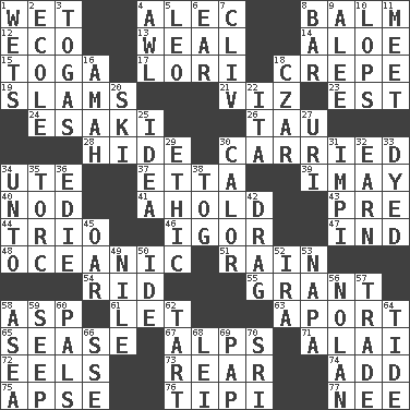 ACROSS 1. Dripping 4. Actor Baldwin 8. Lip ointment 12. Environmental prefix 13. Welt 14. Medicinal plant 15. Ancient Roman robe 17. Australian parrot (variant) 18. Streamer paper 19. Criticizes harshly 21. To wit 23. Eastern Standard Time (abbr.) 24. 1973 Nobel Price Winner (Physics) Leo 26. The 19th letter of the Greek alphabet 28. Flintstone garb 30. Borne 34. Shoshoni 37. Singer James 39. "If ____ say so..." 40. Lower and raise head in agreement 41. Hold, grip (Informal) 43. Before (prefix) 44. Musical group of three 46. Composer Stravinsky 47. Working for oneself (abbr.) 48. Pertaining to the sea 51. Water falling in drops from the sky 54. To free from 55. Monetary aid 58. Viper 61. Allow 63. To the left, to Queeg 65. Gospel singer Marvin 67. High mountains 71. Mountain range southwest of Kyrgyzstan 72. Snakelike fish 73. Hitchcock's "____ Window" 74. Say or write further 75. Domed church section 76. Native american tent (variation) 77. Born DOWN 1. Soaks 2. Learning spot: Fr. 3. Ancient Roman robes 4. Leather borer 5. Lion 6. Ewer handle 7. 154 in Roman numerals 8. Oblong piece of solid material 9. Toward shelter 10. Chops off 11. Rendezvous 16. Wet nurse 18. Russian ruler of old 20. What Jean-Claude Killy likes to do 22. Call ___ day 25. The content of cognition 27. RI univ. 29. Principle of right and wrong 30. Bodily heat indicating an inflammation 31. Body of Kaffir warriors 32. Merit 33. Colored 34. To (old English) 35. Torque (variant) 36. Singer Brickell 38. Coat; cloak 42. To trail on the ground 45. Boat paddle 49. The longest river in the world 50. Binary compound 52. Lyricist Gershwin 53. California wine valley 56. Pitcher Ryan 57. Buy and sell 58. Toward the sea 59. Ooze 60. Friends 62. Small pie 64. Periodic rise and fall of the sea level 66. Compass dir. 68. Flowery wreath 69. Infant food 70. _ Lanka