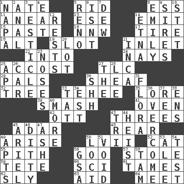 ACROSS 1. Nathan's nickname 5. To free from 8. Curvy letter 11. Approach 13. Compass dir. 14. Give off 15. Thick mixture 16. Compass dir. 17. Become fatigued 18. Keyboard modifier key 19. Slit 21. An arm off of a larger body of water 22. To the inside or interior of 24. Negative votes 25. Buttonhole 27. Affectionate concern, for short 29. Friends 30. Archer's quiver 32. Relationship diagram 33. Giggle 35. Old wives' tales, e.g. 39. Box-office sellout 41. Baking chamber 42. Baseball player Mel 43. Threesomes 45. The sixth month of the Jewish calendar 48. Tail end 49. Originate 50. 57 in ancient Rome 52. Domesticated feline 55. Heart or essence 56. Thick or sticky substance 57. Took without asking 59. Wig 60. _-fi 61. Makes less strong or intense 62. Secret 63. Help 64. Rendezvous DOWN 1. California wine valley 2. Of or related to the anus 3. A testis 4. Consume 5. Western Nevada city 6. Is not 7. Morning condensation 8. Poet Dickinson 9. Fathers 10. Proofreading order 12. Musical pauses 14. Inactive volcano in Sicily 20. Car dealer's back yard 21. South American Indian 23. Olfactory organs 25. Fitting 26. 4-wheeled motor vehicle 27. Definite Article 28. Area sheltered from the wind 30. Quiet! 31. Plants 33. Make lace 34. Eastern Standard Time (abbr.) 36. Conquer 37. Portuguese money of account (variant) 38. Followers of ems 40. Greater amount 43. Three (prefix) 44. Robbery 45. Satellite of Uranus 46. Simple song 47. American tennis player Robert 49. Tenement units (abbr.) 50. Locales 51. Lacking any legal or binding force 53. Toward shelter 54. Trial 56. Girls' org. (abbr.) 58. Scottish cap