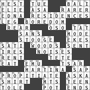 ACROSS 1. Behest 5. Third day of the wk. 8. Indonesian resort city 12. Writer Wiesel 13. White ___ sheet 14. Less widely known 15. Pulitzer Prize-winning author Ferber 16. Homes 19. Part of a journey 20. Mood resulting from idleness 21. Stern 23. Bear (Spanish) 24. Make lace 27. Without 30. Method 31. Moe Howard, for one 34. Makes supply last 35. Suttee (variant) 38. Forest 40. Posted 41. Angers 42. Annoying sounds 44. Monthly bill 45. False hair 46. Consume 47. Australian flightless bird 50. Russian ruler of old 53. Chrissie's court nemesis 57. Plant excrement 59. Appease 63. "____ silly question..." 64. Chest covering 65. Mountains (abbr.) 66. Adolescent 67. Lacquered or enameled metalware 68. Cooking vessel 69. Extremities DOWN 1. The bottom of a shoe or boot 2. A person who is older than you are 3. Burn superficially 4. Afternoon social gathering 5. Pacific island yam 6. One who uses or employs something 7. Comfort 8. Prohibit 9. Curve 10. Area sheltered from the wind 11. Big collection agency 14. San ____ (Riviera town) 17. Wedding promise 18. Two (Sp.) 20. Naughty child 22. Help 24. Puff or smoke 25. An important port of Yemen 26. Trial 28. At this time 29. Within a short period 30. Makes clutter 32. Thick or sticky substance 33. Prepare for publication 35. Male parent of an animal 36. Length times width 37. Portable shelter 39. Compass dir. 43. Singer James 47. Give off 48. Floor protector 49. RI univ. 51. NE Netherlands city 52. Moved through 54. Pack (down) 55. "Tell ____ the Marines!" 56. A home for chicks 58. Baking dishes 59. Pacific Standard Time (abbr.) 60. 17th letter of the Greek alphabet 61. Petroleum 62. Before (prefix) 63. Had dinner