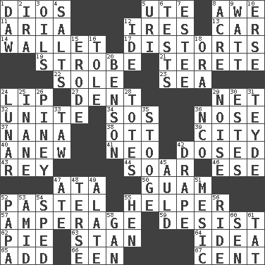ACROSS 1. "Vaya con ____" 5. Shoshoni 8. Deep reverence 11. Roberta Peters solo 12. Angers 13. Auto 14. Place for singles 17. What propaganda does 19. Disco prop 21. Cylindrical with tapered ends 22. Flatfish 23. Ocean 24. Mouth edge 27. Gouge 29. Fish or hair follower 32. Join together 34. Distress signal 36. Sense of smell 37. Grandmother 38. Baseball player Mel 39. Municipality 40. Afresh 41. Modern: prefix 42. Administered medicine 43. Marina Del _, California 44. Fly high 46. Compass dir. 47. _ moment's notice (2 wds.) 50. Island territory of the United States 52. Soft color 55. Assistant 57. Electrical Measurement 59. Stop 62. Sliced dessert 63. Comedian Laurel of Laurel & Hardy 64. It may be bright or harebrained 65. Find the sum of 66. Car or cant ending 67. Penny DOWN 1. Obsolete 2. Retirement account (abbr.) 3. Lubricates 4. Table seasonings 5. RI univ. 6. Trials 7. First name in cosmetics 8. 1/640 square mile 9. Electrical Unit 10. Celtic language 12. Binary compound 15. Eat (away) 16. Lacquered or enameled metalware 18. Mouth or opening 20. Gillaume's butler role 24. Type of eclipse 25. Empty; void 26. Abounding in pines 28. Hauls 29. Annoying sound 30. _____ Park, CO 31. Miss Universe 1986, Barbara Palacios _ 33. The 23rd letter of the Hebrew alphabet 35. Moe Howard, for one 36. Non-commissioned officer (abbr.) 42. Window treatment 45. Old (Scot.) 47. Had dinner 48. Laconic 49. Having winglike extensions 51. Mesonic 52. Dad 53. Among 54. Moved rapidly 55. Layer 56. Travel on an animal 58. Separate the seeds from cotton 60. Elected rep. 61. Make lace