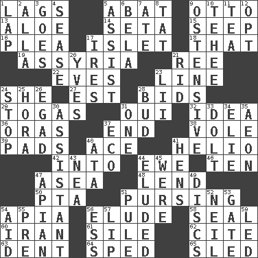 ACROSS 1. Fails to keep up a pace 5. Blind as ____ 9. Von Bismarck 13. Medicinal plant 14. Stalk of a moss capsule 15. Ooze 16. Entreaty 17. Small island 18. Not this but _ 19. Nineveh was its capital 21. Portuguese money of account (variant) 22. Nights before holidays 23. Actor's bit 24. A female animal or person 27. Eastern Standard Time (abbr.) 28. Auction offers 29. Ancient Roman robes 31. Fr. "Yes" 32. The content of cognition 36. Mouths or openings 37. Conclusion 38. Short-tailed, large-bodied rat 39. Writing tablets 40. Adept person 41. Sun: prefix 42. To the inside or interior of 44. She-sheep 46. "___ Little Indians" 47. Toward the sea 48. Grant temporary use of 50. Parent Teacher Association (abbr.) 51. Puckering 54. Capital of Western Samoa 56. Dodge 58. Lick closed 60. SW Asia republic 61. Drop; flow; fall 62. Quote 63. Undesirable depression on a surface 64. Drove too fast 65. Downhill vehicle DOWN 1. Pet locale 2. Silent film actress Nazimova 3. Moves 4. Gospel singer Marvin 5. Help 6. Actor Lugosi 7. Had dinner 8. Make lace 9. Clearly or manifestly demonstrative 10. Giggle 11. Afternoon social gathering 12. Elect 17. Angers 20. Jacques Cousteau's middle name 21. To free from 23. Cards in a Roman deck? 24. Discontinue 25. Israeli folk dance 26. Mild oath 28. Partially opened flower 30. Aide 31. Single 33. Dunce 34. Writer Wiesel 35. A really long time 37. Environmental prefix 40. _ moment's notice (2 wds.) 41. Coop moms 43. Teachers' org. 44. Evaded 45. Past tense of be (plural) 47. Bee-related 49. Plates 51. Whine 52. Famous astronaut Armstrong 53. Yard entry 54. Assist 55. Before (prefix) 56. Double-curved letter 57. Mouth edge 59. Directed