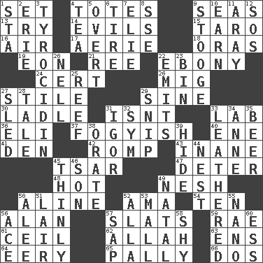 ACROSS 1. Arrange properly for use 4. Lugs 9. Oceans 13. Attempt 14. Vices 15. Pacific island yam 16. Wind 17. Nest on high 18. Mouths or openings 19. Period of immesurable duration 21. To sift 22. Black 24. Certainty 26. Russian fighter aircraft 27. Vertical member of a panel or frame 29. Trig term 30. Dipping utensil 31. Is not 33. Experiment locale 36. Biblical high priest 37. Out of fashion; old fashioned 40. Compass dir. 41. Lair 42. Frolic 43. Silly 45. Russian ruler of old 47. Prevent from occurring 48. Being at a high temperature 49. Soft 50. Place in a line 52. Housemaid (var.) 54. Nine, plus one 56. Actor Alda or Thicke 57. Narrow boards 59. Actress Charlotte 61. To provide with a ceiling 62. Assad's deity 63. Followers of ems 64. Suggestive of the supernatural 65. Friendly 66. Two (Sp.) DOWN 1. R.R. building 2. 4th largest of the Great Lakes 3. Polypeptide antibiotic 4. Afternoon social gathering 5. Unconcealed 6. Become fatigued 7. Writer Wiesel 8. Compass dir. 9. Moe Howard, for one 10. Merit 11. Like ___ of sunshine 12. Distress signal 20. 1994 drama film starring Jodie Foster 22. Sends forth 23. Storage container 25. Coral ridge 27. Downhill vehicle 28. Falsehood 29. Clip 31. Composer Stravinsky 32. Symbol (abbr.) 33. Resembling or made to resemble leather 34. Singer Murray 35. Fermented drink made from hops 38. Declaim 39. Flintstone garb 44. Egg locale 45. Without force or sincere effort 46. Boy, to dad 49. Brizilian seaport 50. Toward shelter 51. Den 52. Silent film actress Nazimova 53. Shopping center 55. Billionth: prefix 56. Adept person 57. Plant excrement 58. Like a shrinking violet 60. Double-curved letter