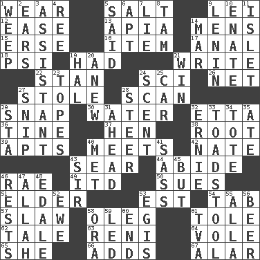 ACROSS 1. Erode 5. Table seasoning 9. Flowery wreath 12. Relaxation 13. Capital of Western Samoa 14. Not women's 15. Celtic language 16. A whole individual unit 17. Of or related to the anus 18. 23rd letter of the Greek alphabet 19. Possessed 21. Compose 22. Comedian Laurel of Laurel & Hardy 24. _-fi 26. Remaining after all deductions 27. Took without asking 28. Examine hastily 29. Fastener 30. Wetness 32. Singer James 36. Prong on a fork 37. Layer 38. Carrot, for example 39. Flats, for short 40. Confronts 42. Nathan's nickname 43. Dry up 44. Stay 46. Actress Charlotte 49. It would 50. Takes to court 51. A person who is older than you are 53. Eastern Standard Time (abbr.) 54. Keyboard key 57. Cole _ (cabbage dish) 58. Cassini of fashion 61. Lacquered or enameled metalware 62. Falsehood 63. Painter Guido (1575-1642) 64. Short-tailed, large-bodied rat 65. A female animal or person 66. Does sums 67. Having or resembling wings DOWN 1. Shed a tear 2. Hearing organs 3. Helper 4. To sift 5. Alleged 6. Fitting 7. Untruth 8. Scottish cap 9. Soviet premier 1918-24 10. Related on the mother's side 11. Small island 14. Make imperfect 19. Actor Linden 20. Afresh 21. Victory 23. Drinks excessively 24. Aroma 25. Auto 27. Sever or remove by pinching or nipping 28. Navigate 29. R.R. building 31. At or in the front 32. Bert's buddy 33. Inedible or poisonous agaric 34. Carry 35. Had dinner 40. Was introduced to 41. Backtalk 43. Title for a knight 45. With the exception that 46. Musical pauses 47. Assad's deity 48. Peak District village in England 52. She-sheep 53. Armor plate that protects the chest 55. Silent film actress Nazimova 56. Fermented drink made from hops 58. Mouth or opening 59. Directed 60. Conclude 61. Federal power corp.