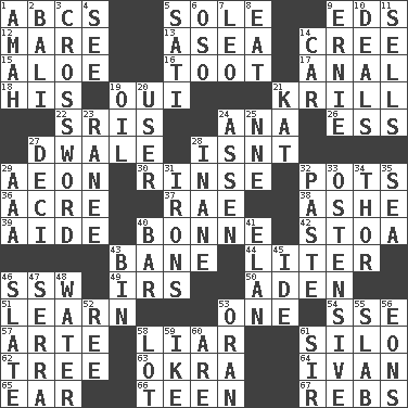 ACROSS 1. Lettered men learn these first 5. Flatfish 9. Begley and Asner 12. Female horse 13. At sea 14. Algonquian 15. Medicinal plant 16. A blast of a horn 17. Of or related to the anus 18. Part of HMS, perhaps 19. Fr. "Yes" 21. Shrimp-like planktonic crustaceans 22. Indian titles of respect 24. Santa ___, CA 26. Curvy letter 27. A sleeping potion; an opiate (poet.) 28. Is not 29. A really long time 30. Remove soap 32. Plant holders 36. 43,560 square feet 37. Actress Charlotte 38. American tennis player Robert 39. Helper 40. Child's nurse 42. Portico 43. Object of repulsion 44. 61 cubic inches 46. Compass dir. 49. Big collection agency 50. An important port of Yemen 51. Acquire or gain knowledge or skills 53. Single 54. Compass dir. 57. Johnson of "Laugh-In" 58. One who doesn't tell the truth 61. Grain storage tower 62. Family _ (genealogy) 63. Gumbo ingredient 64. _ the terrible 65. Hearing organ 66. Adolescent 67. Confederate soldiers (slang) DOWN 1. Nursemaid 2. Indonesian resort city 3. What you're doing now 4. Perceive with the eye 5. Suttee (variant) 6. Bear (Spanish) 7. Lion 8. Consume 9. Bert's buddy 10. Allots cards 11. Makes a sale 14. Automobile 19. Lubricate 20. One who makes use of a thing 21. Krazy ___ of comics 23. The wife of a rajah (variant) 24. NE Netherlands city 25. Compass dir. 27. Tenth: prefix 28. Lacking in sense or substance 29. Auto club (abbr.) 31. Removes the wrinkles 32. Thick mixture 33. Clearly or manifestly demonstrative 34. Son of Odin 35. Ocean 40. Tavern 41. Style 43. Storage container 45. Binary compound 46. Schedule 47. Father Junipero _ 48. Wetness 52. To riddle 53. Northwest Algerian city 55. Broad, flat, thick piece 56. Immeasurably long periods of time 58. Car dealer's back yard 59. D.D.E's nickname 60. "We ___ not amused" (Victoria) 61. Title for a knight