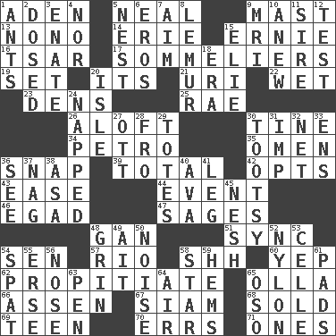 ACROSS 1. Arabian gulf 5. Be tempered by heat 9. Vertical spar for supporting sails 13. Words to Nanette 14. One of the Great Lakes 15. Bert's buddy 16. Russian ruler of old 17. Wine waiters 19. Arrange properly for use 20. It is 21. RI univ. 22. Dripping 23. Cub Scout units 25. Actress Charlotte 26. Upward 30. Prong on a fork 34. Stone: prefix 35. Sign of things to come 36. Fastener 39. "_____ Recall" 42. Chooses 43. Relaxation 44. Incident 46. Mild oath 47. Gurus 48. Separate the seeds from cotton 51. Synchronize (abbr.) 54. Elected rep. 57. _ de Janeiro 58. Quiet! 60. Slangy assent 62. Conciliate 65. Spanish pot 66. NE Netherlands city 67. Thailand, formerly 68. Disposed of to a purchaser 69. Adolescent 70. Blunders 71. Singles DOWN 1. Pismires 2. Administered medicine 3. Maternal 4. And not 5. A home for chicks 6. Greek god of love 7. Direct toward a target or goal 8. Arboreal primate 9. Medical imaging device (abbr.) 10. Afresh 11. Title for a man of rank and authority 12. Trial 15. Writer Wiesel 18. Epoch 20. Small island 24. Slept 27. Baseball player Mel 28. From 29. Hauls 30. Tootsie (variant) 31. Mischievous child 32. Fish or hair follower 33. Followers of ems 36. Perceive with the eye 37. Tired old horse 38. White ___ sheet 40. Actress Gardner 41. Part of a journey 45. Soft 48. Broad smile 49. Small island 50. Annoying sound 52. Thermoplastic polyamide 53. Cell (Danish) 54. Argument over a trivial matter 55. Celtic language 56. Sense of smell 58. Play the lead 59. Equivocates 61. Writing tablets 63. Writing instrument 64. Wind 65. Bear (Spanish)