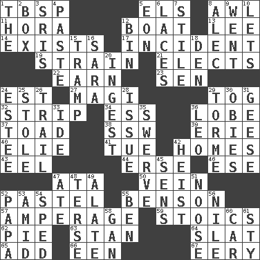 ACROSS 1. Cook's measure (abbr.) 5. Raised railways 8. Leather borer 11. Israeli folk dance 12. Water vessel 13. Area sheltered from the wind 14. Has an existence 17. Happening 19. Put through a sieve 21. Chooses 22. Merit 23. Elected rep. 24. Eastern Standard Time (abbr.) 27. Wise men 29. Coat; cloak 32. Remove all contents or possession from 34. Curvy letter 36. Ear part 37. Frog relative 38. Compass dir. 39. One of the Great Lakes 40. Writer Wiesel 41. Third day of the wk. 42. Dwellings 43. Snakelike fish 44. Celtic language 46. Compass dir. 47. "One Day ___ Time" 50. Distinctive style or manner 52. Soft color 55. Gillaume's butler role 57. Electrical Measurement 59. Unemotional ones 62. Sliced dessert 63. Comedian Laurel of Laurel & Hardy 64. Narrow board 65. Increase 66. Car or cant ending 67. Suggestive of the supernatural DOWN 1. Definite Article 2. Gift holder 3. Indian titles of respect 4. Thick mixture 5. A really long time 6. Shoestrings 7. Vertical member of a panel or frame 8. Actor Baldwin 9. Gone 10. Allows 12. Storage container 15. _____ steamer (cargo ship) 16. "Two Mules for Sister ____" 18. Lair 20. Swallow 24. First name in cosmetics 25. Fur scarf 26. Lag or linger behind 28. Come out of 29. Singer Mel 30. Off-Broadway awards 31. Honkers 33. Binary compound 35. Turn aside suddenly 36. Lion 42. Robbery 45. Elected reps. 47. Had dinner 48. Laconic 49. Having winglike extensions 51. Trap for birds or small mammals 52. Dad 53. Among 54. Broke a traffic law 55. Benjamin's nick name 56. Mediterranean tributary 58. Separate the seeds from cotton 60. 4-wheeled motor vehicle 61. Filthy place