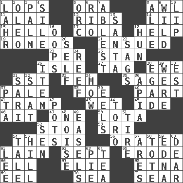 ACROSS 1. Chops off 5. Mouth or opening 8. Leather borer 11. Mountain range southwest of Kyrgyzstan 12. Teases 14. Cards in a Roman deck? 15. Phone greeting 17. Root beer relative 18. Aid 19. Lover boys 21. Followed as a consequence or result 23. For each 25. Comedian Laurel of Laurel & Hardy 26. Small island 27. Label 28. She-sheep 31. Fast jet (abbr.) 33. Opposite of masc. 35. Gurus 37. Diluted with white 38. Enemy 40. Piece 41. _____ steamer (cargo ship) 43. Dripping 45. Binary compound 46. Small island 47. Single 50. Globular water bottle used in Asia 52. Portico 53. Indian title of respect (Mr.) 54. College paper 56. Spoke pompously 61. (Had) reclined 62. Back-to-school mo. 65. Eat (away) 66. Pipe bend 67. Writer Wiesel 68. Inactive volcano in Sicily 69. Snakelike fish 70. Ocean 71. Wither DOWN 1. Cowardly lion portrayer 2. Butter sub 3. Inside of hand 4. Filth; sediment 5. The grampus (Milton) 6. _ de Janeiro 7. Most capable 8. Toward shelter 9. Uncontrolled 10. Mouth edge 13. Before Barbara or Clara 16. I made a mistake 18. Attila the _ 20. Automatically 22. Settles 24. Coral ridge 26. Detail 28. Mild oath 29. Past tense of be (plural) 30. Eastern Standard Time (abbr.) 31. Indian skirt 32. Narrow board 34. Cut the grass 36. Capital of Western Samoa 37. Parent Teacher Assoc. 39. Snakelike fish 42. Cooking vessels 44. "Corrida" creature 48. Annoying sound 49. Artist's stands 51. Hoop that covers a wheel 52. Elected rep. 54. Story 55. Land elevation 57. Ancient Greek god of war 58. Haul 59. Pulitzer Prize-winning author Ferber 60. Letter starter 61. Area sheltered from the wind 63. Sliced dessert 64. Afternoon social gathering