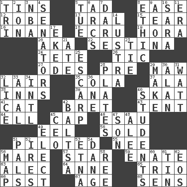 ACROSS 1. Canisters 5. Bit 8. Comfort 12. Loose flowing garment 13. Mountain range 15. Pull apart 16. Silly 18. Shade of tan 19. Israeli folk dance 20. Alias (abbr.) 22. French poetic form 24. False hair 26. Nervous spasm 27. Lyric poems 28. Before (prefix) 29. Informal term for the mouth 32. Den 35. Root beer relative 37. According to 38. Restaurants 39. Santa ___, CA 40. Three-handed card game 41. Domesticated feline 42. Cy Young winner Saberhagen 43. Portable shelter 44. Pipe bend 45. Head covering 46. Son of Isaac 49. Snakelike fish 50. Disposed of to a purchaser 51. Manned the helm 55. Born 56. Female horse 57. Play the lead 59. Related on the mother's side 63. Actor Baldwin 64. Queen of England 1702-14 65. Musical group of three 66. Inconspicuous attention getter 67. Ripen 68. Elected reps. DOWN 1. Three (prefix) 2. Electrically charged atom 3. Basketball assoc. 4. Elected representatives 5. Third day of the wk. 6. Arches 7. Have the gumption 8. Value system 9. Period of immesurable duration 10. "Two Mules for Sister ____" 11. Period 14. A period of five years 17. Made supply last 21. Had dinner 23. Make a knot 25. Fortification 28. Food holders 29. Cause to be 30. ____ Jay Lerner 31. Electrical Unit 32. Louse (plural) 33. Of or related to the anus 34. International (abbr.) 36. Single 40. SAT takers 42. Greek mezzo-soprano Agnes 45. Corporate head (abbr.) 47. Male offspring 48. Toward shelter 49. Choose 51. Friends 52. Angers 53. Inactive volcano in Sicily 54. Mild oath, euphamism for damn 56. Atlas unit 58. Portuguese money of account (variant) 60. "We ___ not amused" (Victoria) 61. Shallow baking pan 62. Greek goddess of the dawn