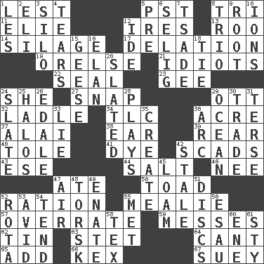 ACROSS 1. For fear that 5. Pacific Standard Time (abbr.) 8. Three (prefix) 11. Writer Wiesel 12. Angers 13. Friend of Pooh 14. Fodder prepared in a silo 17. Conveyance 19. Threatening words 21. Foolish or stupid persons 22. Lick closed 23. Unit of force equal to gravity 24. A female animal or person 27. Fastener 29. Baseball player Mel 32. Dipping utensil 34. Affectionate concern, for short 36. 43,560 square feet 37. Jai ____ 38. Hearing organ 39. Bring up, as a child 40. Lacquered or enameled metalware 41. Color 42. Heaps 43. Compass dir. 44. Table seasoning 46. Born 47. Had dinner 50. Frog relative 52. Food allowance for one day 55. Ear of corn 57. Make much ado about nothing 59. Makes clutter 62. Metal container 63. Proofreading order 64. Patter 65. Say or write further 66. A weed 67. Chop _ DOWN 1. French article 2. Biblical high priest 3. Grain storage tower 4. Rends 5. Before (prefix) 6. Major League Baseball Commissioner Bud 7. Sadhe (variant) 8. Musical group of three 9. Carrot, for example 10. Charged particles 12. Binary compound 15. Honkers 16. Style 18. Make a knot 20. Scheduled 24. Chalkboard 25. Rings 26. Peak District village in England 28. Romps 29. Sea 30. Exchange 31. Laconic 33. Whopper 35. Cause to be 36. Curve 42. Having lost freshness 45. Rich soil 47. Atmosphere 48. Cod relative 49. Related on the mother's side 51. Plates 52. Round or rotation of duties 53. Enthusiastic 54. Look after 55. Was introduced to 56. Son of Isaac 58. John Ritter's dad 60. Compass dir. 61. Filthy place