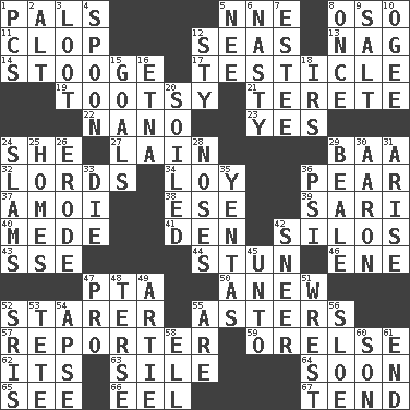 ACROSS 1. Friends 5. Compass dir. 8. Bear (Spanish) 11. Hoof sound 12. Oceans 13. Tired old horse 14. Moe Howard, for one 17. A testis 19. A girl or young woman (variant) 21. Cylindrical with tapered ends 22. Billionth: prefix 23. It is so 24. A female animal or person 27. (Had) reclined 29. Sound made by sheep 32. Domineers 34. Myrna of the movies 36. Lightbulb-shaped fruit 37. Mine, in Marseilles 38. Compass dir. 39. Indian skirt 40. Ancient Persian 41. Lair 42. Grain storage towers 43. Compass dir. 44. Surprise greatly 46. Compass dir. 47. Parent Teacher Association (abbr.) 50. Afresh 52. A viewer who gazes fixedly 55. Michaelmas daisies 57. Newsperson 59. Threatening words 62. It is 63. Drop; flow; fall 64. Within a short period 65. Observe 66. Snakelike fish 67. Watch over DOWN 1. Personal Computers (abbr.) 2. Keyboard modifier key 3. Spoils 4. Soup utensil 5. Born 6. Characterized by obscenity 7. First name in cosmetics 8. Single time 9. Table seasoning 10. Double curve, resembling the letter S 12. Filthy place 15. Scores awarded for successful feats 16. Inactive volcano in Sicily 18. Big collection agency 20. Dirtied 24. Criticizes harshly 25. Dwellings 26. Eat (away) 28. Olfactory organs 29. Memphis, Tenn. Street 30. Composer Copland 31. Originate 33. Expire 35. Gossips 36. Air pressure measure (abbr.) 42. Contemptuous expression 45. To (old English) 47. Adept person 48. Laconic 49. Nick name for Arthur 51. Obtain by seizing forcibly or violently 52. Indian titles of respect 53. False hair 54. Domed church section 55. "We ___ not amused" (Victoria) 56. _ gin 58. Pipe bend 60. Male offspring 61. Conclude