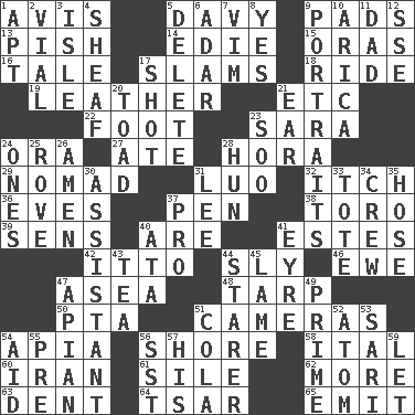 ACROSS 1. Advice 5. _ Jones' Locker 9. Groovy apts. 13. Expression of disdain 14. Singer Brickell 15. Mouths or openings 16. Story 17. Shuts with force 18. Travel on or in a vehicle 19. Cordwainer's material 21. And so on (abbr.) 22. 12 inches 23. "Two Mules for Sister ____" 24. Mouth or opening 27. Had dinner 28. Israeli folk dance 29. Roamer 31. Nilotic language 32. Hankering 36. Nights before holidays 37. Writing instrument 38. "Corrida" creature 39. Elected reps. 40. "We ___ not amused" (Victoria) 41. _____ Park, CO 42. "Tell ____ the Marines!" 44. Insidious 46. She-sheep 47. Toward the sea 48. Canvas cover 50. Parent Teacher Assoc. 51. Devices for capturing images 54. Capital of Western Samoa 56. Dinah or Pauly 58. Slanted text style (abbr.) 60. SW Asia republic 61. Drop; flow; fall 62. Greater amount 63. Undesirable depression on a surface 64. Russian ruler of old 65. Give off DOWN 1. Fitting 2. Small bottle 3. Capri or Wight 4. Archer's quiver 5. Keyboard key 6. The sixth month of the Jewish calendar 7. Zeal 8. Consenting reply 9. Likenesses of persons 10. N. Chile seaport 11. June honoree 12. Compass dir. 17. Went for two points 20. Frog relative 21. Ewer handle 23. "Barney Miller" actor Jack 24. Singles 25. Be footloose 26. So be it 28. Attila the _ 30. Aide 31. Area sheltered from the wind 33. Carry 34. Ship's personnel 35. Stockings 37. Adept person 40. "One Day ___ Time" 41. Jane of fiction 43. Afternoon social gathering 44. A viewer who gazes fixedly 45. Unable to walk 47. Bee-related 49. First class 51. Root beer relative 52. Tiny particle 53. Indian skirt 54. Assist 55. Before (prefix) 56. Fast jet (abbr.) 57. Part of HMS, perhaps 59. Allow