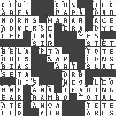 ACROSS 1. Penny 5. Music discs 8. Affectionate concern, for short 11. Length times width 12. Dad 14. Boat paddle 15. Typical models 17. Ethiopian city, capital of Harari 18. Adept person 19. Contrary to your interests or welfare 21. Epoch 22. Color 23. Area sheltered from the wind 24. _ tizzy (2 wds.) 25. Affirmative reply 27. Title for a knight 28. Proofreading order 31. Actor Lugosi 35. Parent Teacher Assoc. 37. Lug 38. Lyric poems 39. Plant excrement 41. Immeasurably long periods of time 42. Prejudice 43. Tate display 45. Narrow board 46. Stalk of a moss capsule 47. Globe 49. Part of HMS, perhaps 51. Modern: prefix 52. Lion 55. Compass dir. 57. Santa ___, CA 60. Rending 62. Hearing organ 63. Role for Stallone 65. Add up to 66. Had dinner 67. Small Philippine buffalo 68. False hair 69. Directed 70. Wind 71. Ancient Greek god of war DOWN 1. Lessep's creation 2. Eat (away) 3. Boldness 4. Not wild 5. Tax preparer (abbr.) 6. Have the gumption 7. Coast Guard woman 8. Inedible or poisonous agaric 9. Made of lace 10. Algonquian 13. Like ___ of sunshine 16. Indian titles of respect 17. Centers 20. Sever or remove by pinching or nipping 26. _____ Park, CO 29. Inactive volcano in Sicily 30. Trial 31. Moves up and down 32. Singer Brickell 33. Resembling or made to resemble leather 34. Slender Brazilian palm 36. American Automobile Association (abbr.) 40. Right away 44. Woody plant 48. Water vessel 50. "Two Mules for Sister ____" 52. 61 cubic inches 53. Maternal 54. Stares at amorously 55. Actress Patricia 56. Nathan's nickname 58. Grandmother 59. Mine, in Marseilles 61. Round or rotation of duties 64. Long, evenly shaped piece