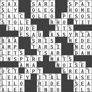 ACROSS 1. Saxophone 4. Indian skirt 8. Argument over a trivial matter 12. Wily 13. Cassini of fashion 14. Residence 15. Baby powder 17. Butter sub 18. Mexican monetary units 19. Took without asking 21. 17th letter of the Greek alphabet 23. Teat (slang) 24. Dodge 26. It is 28. He sold his birthright 30. Nineveh was its capital 34. Sound made by sheep 37. Indian titles of respect 39. Ancient Persian 40. Electrical Unit 41. Tarsus (plural) 43. Modern: prefix 44. Allows 46. Russian ruler of old 47. One of the 12 tribes of Israel 48. Stimulate to action 51. Floor protectors 54. Nursemaid (var.) 55. Annoying sound 58. Sep. follower 61. Fitting 63. Relatively large 65. Like summer trees 67. Slanted text style (abbr.) 71. Relaxation 72. _ and Stitch 73. Travel on an animal 74. Ocean 75. Toward shelter 76. Inside; within (prefix) 77. Raised railways DOWN 1. Fast planes 2. Having winglike extensions 3. Xylene (variant) 4. "Barney Miller" actor Jack 5. Everything 6. To separate or throw off 7. Composer Stravinsky 8. A female animal or person 9. Mail 10. Mine, in Marseilles 11. Trial 16. A slight indication 18. Cooking vessels 20. Begley and Asner 22. Part of HMS, perhaps 25. Compass direction 27. Symbol (abbr.) 29. A salt of uric acid 30. Indian state 31. Tear apart 32. The main thing one is thinking about 33. Period of immesurable duration 34. Indonesian resort city 35. So be it 36. Tenement units (abbr.) 38. Big collection agency 42. SW Asia republic 45. Health resort 49. "If ____ say so..." 50. Hit sharply and swiftly 52. Coat; cloak 53. Beget 56. Gospel singer Marvin 57. Artist's stand 58. Water jar 59. To provide with a ceiling 60. Story 62. Become fatigued 64. Afternoon social gatherings 66. Enemy 68. Shallow baking pan 69. Say or write further 70. Lion