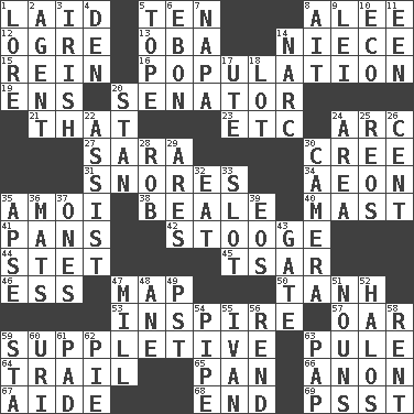ACROSS 1. Put down 5. "___ Little Indians" 8. Toward shelter 12. Legendary monster 13. Chief or king in Benin or Nigeria 14. Sibling's daughter 15. It's straight from the horse's mouth 16. Census information 19. Followers of ems 20. Elected representative 21. Not this but _ 23. And so on (abbr.) 24. Curve 27. "Two Mules for Sister ____" 30. Algonquian 31. Sounds asleep 34. Period of immesurable duration 35. Mine, in Marseilles 38. Memphis, Tenn. Street 40. Vertical spar for supporting sails 41. Zero-star reviews 42. Moe Howard, for one 44. Proofreading order 45. Russian ruler of old 46. Double-curved letter 47. Atlas unit 50. Hyperbolic tangent 53. Motivate 57. Boat paddle 59. Supplementary 63. Whine 64. Drop behind 65. Baking dish 66. Soon (poet.) 67. Helper 68. Conclude 69. Inconspicuous attention getter DOWN 1. Old wives' tales, e.g. 2. Representative 3. From or relating to Ireland 4. Lair 5. Drink excessively 6. Inky black, to poets 7. California wine valley 8. Small island 9. Flowery wreath 10. Environmental prefix 11. Car or cant ending 14. Drug cop 17. Shoshoni 18. Car dealer's back yard 20. Comedian Laurel of Laurel & Hardy 22. Help 24. Type of rug 25. Vintage cars 26. Penny 28. Director Reiner 29. Ancient Greek god of war 30. Device for capturing images 32. Consume 33. Slit 35. Domed church section 36. Floor coverings 37. Singles 39. Greek goddess of the dawn 43. Yard entry 47. Place where flour is made 48. One (Scot) 49. Pacific Standard Time (abbr.) 51. Parts of speech 52. Radiant circles of light 54. Corncob 55. "Terrible" tsar 56. Tear apart 58. Monthly bill 59. R.R. building 60. RI univ. 61. Groovy apt. 62. Sliced dessert 63. Infant food
