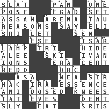 ACROSS 1. Narrow board 5. Baking dish 8. Single 11. Introduce or present, as a question 12. Mild oath 14. Arrange properly for use 15. Indian state 17. Sports stadium 18. The 19th letter of the Greek alphabet 19. Thinks logically 21. Declare 22. Biblical high priest 23. Indian title of respect (Mr.) 24. Allow 25. Elected rep. 27. Compass dir. 28. Russian ruler of old 31. Desk light 35. Three (prefix) 37. Flintstone garb 38. Toward shelter 39. What Jean-Claude Killy likes to do 41. _ the terrible 42. Charged atoms 43. Period 45. Foregone conclusion 46. Make new 47. The grampus (Milton) 49. White ___ sheet 51. Teachers' org. 52. Title for a knight 55. Big _ 57. Lyricist Gershwin 60. Center 62. Black tropical American cuckoo 63. Administered medicine 65. Leg joints 66. Make lace 67. Nights before holidays 68. Gouge 69. Cunning 70. Consume 71. Indian titles of respect DOWN 1. Practice fights 2. Failure 3. Slender Brazilian palm 4. Beverages made from leaves 5. For each 6. Eras 7. Nanny 8. Clearly or manifestly demonstrative 9. Actress Patricia 10. Needle holder 13. 24-hour periods 16. Undercover agent 17. Michaelmas daisies 20. A home for chicks 26. Principle of right and wrong 29. The sixth month of the Jewish calendar 30. Monthly bill 31. Den 32. _ vera 33. Ananias' fault 34. Mexican monetary units 36. Eisenhower's nickname 40. Pressed 44. Ancient Greek god of war 48. Keg 50. Helper 52. Contemptuous expression 53. Ancient Celtic tribe of eastern Britain 54. Musical pauses 55. Floor coverings 56. Of or related to the anus 58. Be footloose 59. Toward the sea 61. Conclusions 64. Eastern Standard Time (abbr.)