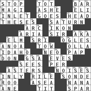 ACROSS 1. Constrict 5. Small child 8. Oblong piece of solid material 11. Wise men 12. American tennis player Robert 14. Biblical high priest 15. An arm off of a larger body of water 17. Moves 18. Froth on beer 19. College papers 21. Titan orbits this 23. Curve 25. Image 26. Roberta Peters solo 27. Title for a knight 28. Alias (abbr.) 31. Shade tree 33. Indian title of respect (Mr.) 35. Stares at amorously 37. Small Philippine buffalo 38. Pull behind 40. Spanish pot 41. Potato state 43. Modern: prefix 45. Infant food 46. Spanish title 47. Girls' org. (abbr.) 50. Nights before holidays 52. Perceives with the eye 53. For each 54. Michaelmas daisies 56. Annoying sounds 61. In an inward manner 62. Cause heat under the collar 65. Message 66. Friend of Pooh 67. At sea 68. Nanny 69. A saturated hydrocarbon 70. Teat (slang) 71. Practice fight DOWN 1. Stricken, poetically 2. Hyperbolic tangent 3. Stare 4. Sliced desserts 5. Label 6. Bear (Spanish) 7. College paper 8. Fermented drink made from hops 9. ____ Jay Lerner 10. To free from 13. 1973 Nobel Price Winner (Physics) Leo 16. Pull into pieces 18. Attila the _ 20. Indian titles of respect 22. "Corrida" creature 24. Heavy open wagon 26. Nursemaid 28. Silent film actress Nazimova 29. Seaweed 30. White ___ sheet 31. Inside; within (prefix) 32. Grant temporary use of 34. Electrically charged atom 36. Republicans 37. Help 39. Shed a tear 42. Double curve, resembling the letter S 44. Baking chamber 48. Spanish missionary in California 49. Help 51. Greek god of love 52. Filthy place 54. Soon (poet.) 55. _ gin 57. Charged particles 58. Fastener 59. Pulitzer Prize-winning author Ferber 60. Wither 61. Lyricist Gershwin 63. Flowery wreath 64. Erode