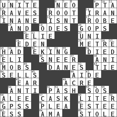 ACROSS 1. Join together 6. Modern: prefix 9. Parent Teacher Association (abbr.) 12. All-night dance parties 13. Carrot, for example 14. SW Asia republic 15. Silly 16. Is not 17. Loose flowing garment 18. Plus 19. Lyric poems 20. Republicans 21. Writer Wiesel 23. Corn or form start 24. Locale of original sin 25. Distance measurement (Brit.) 28. Possessed 30. Supplementing with great effort 34. Passed on 35. Connecticut Ivy Leaguer 36. Contemptuous expression 38. Black tropical American cuckoo 39. Disorderly crowds 41. Natives or inhabitants of Denmark 43. Neckwear 44. Makes a sale 46. Helper 48. Ewer handle 49. Land measure 50. Against 51. Romantic infatuation 53. Mayday 56. Toward shelter 57. Keg 58. 61 cubic inches 60. Global Positioning Systems (abbr.) 61. Entreaty 62. First name in cosmetics 63. Curvy letter 64. Nanny (var.) 65. Fur scarf DOWN 1. RI univ. 2. Grandmother 3. _ the terrible 4. Watched over 5. Compass dir. 6. Olfactory organ 7. Immeasurably long periods of time 8. Baseball player Mel 9. Appease 10. Bar bills 11. One (Scot) 13. Travel on or in a vehicle 14. Pressed 19. Pig sounds 20. Chewing product 22. Area sheltered from the wind 24. The property of being fit to eat 26. Painter Guido (1575-1642) 27. Singer Brickell 28. Equivocates 29. _ vera 31. Indiana (abbr.) 32. Teachers' org. 33. Commissioned mil. rank 37. Arrive at 40. Chalkboards 42. Title for a knight 45. _ Lanka 47. Cease 49. "____ silly question..." 50. High mountains 51. Inside of hand 52. At sea 54. "Beetle Bailey" pooch 55. Sew up the eyelids of hawks and falcons 56. Grow older 57. Tax preparer (abbr.) 58. French article 59. To sift