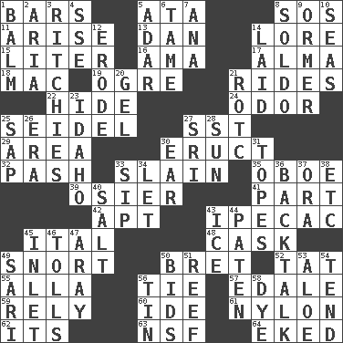 ACROSS 1. Oblong pieces of solid material 5. _ moment's notice (2 wds.) 8. Mayday 11. Originate 13. One of the 12 tribes of Israel 14. Old wives' tales, e.g. 15. 61 cubic inches 16. Housemaid (var.) 17. _ mater 18. Apple computer (short form) 19. Legendary monster 21. Amusement-park features 22. Flintstone garb 24. Aroma 25. Beer mug 27. Fast jet (abbr.) 29. Type of rug 30. Spew [out] 32. Romantic infatuation 33. Killed 35. Mitch Miller's instrument 39. Flexible twig of a willow tree 41. Piece 42. Fitting 43. Medicinal drug used to evoke vomiting 45. Slanted text style (abbr.) 48. Keg 49. Derisive sound 50. Cy Young winner Saberhagen 52. Make lace 55. Silent film actress Nazimova 56. Standoff 57. Peak District village in England 59. Depend 60. Binary compound 61. Thermoplastic polyamide 62. ___ a Wonderful Life 63. Overdraft (abbr.) 64. Supplemented with great effort DOWN 1. Lip ointment 2. Operatic vocal solo 3. Actors Guy, Robert Welles, and Clint 4. Compass dir. 5. The sixth month of the Jewish calendar 6. Not wild 7. Santa ___, CA 8. Twentieth part of a lira 9. Channel Islands abalone 10. Oceans 12. Wear away 14. Put down 20. Set 21. College mil. group 23. Potato state 25. Plant excrement 26. Epoch 27. _ Lanka 28. Player for Phoenix 30. Ewer handle 31. Drinks excessively 33. Small drink 34. Allow 36. Sass 37. Mouth or opening 38. And so on (abbr.) 40. Table seasoning 43. Frozen water 44. Eucharist need 45. An arm off of a larger body of water 46. For Whom the Bell _____ 47. Like ___ of sunshine 49. Indian skirt 50. Auction offers 51. Coral ridge 53. Medicinal plant 54. Look after 56. Metal container 58. Color