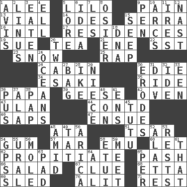 ACROSS 1. Toward shelter 5. _ and Stitch 9. Ache 13. Small bottle 14. Lyric poems 15. Spanish missionary in California 16. International (abbr.) 17. Homes 19. Take to court 20. Afternoon social gathering 21. Compass dir. 22. Fast jet (abbr.) 23. Overwhelm 25. Reproach for some lapse or misdeed 26. Small house or cottage 30. Singer Brickell 34. 1973 Nobel Price Winner (Physics) Leo 35. Travel on an animal 36. Dad 39. Honkers 42. Baking chamber 43. Uhlan (variant) 44. Continued (abbr.) 46. Plant excrements 47. Take place subsequently 48. _ moment's notice (2 wds.) 51. Russian ruler of old 54. Chewing product 57. Make imperfect 58. Australian flightless bird 60. Allow 62. Conciliate 65. Romantic infatuation 66. First course 67. A slight indication 68. Singer James 69. Downhill vehicle 70. Came down and settled, as after flight 71. Take ten DOWN 1. Deliberation 2. "_ and Lucy" (Charlie Brown theme song) 3. Ingested 4. Pipe bend 5. Old wives' tales, e.g. 6. The main thing one is thinking about 7. French article 8. Flexible twig of a willow tree 9. Writing instrument 10. Curves 11. Angers 12. Political cartoonist Thomas 15. Ooze 18. Heredity factor (abbr.) 20. It was, poetically 24. Seas 27. Container for groceries 28. Mamie's husband 29. Sibling's daughter 30. Eats (away) 31. HTML Container Element 32. Binary compound 33. Car or cant ending 36. Product of festering 37. In the manner of 38. Infant food 40. Manchild 41. Followers of ems 45. Ballerina skirt 48. Among 49. Make lace 50. N. Chile seaport 52. Having winglike extensions 53. Musical pauses 54. Global Positioning Systems (abbr.) 55. Mountain range 56. Undercover agent 58. Needle holder 59. Rendezvous 61. Not this but _ 63. Groovy apt. 64. 100% 65. For each