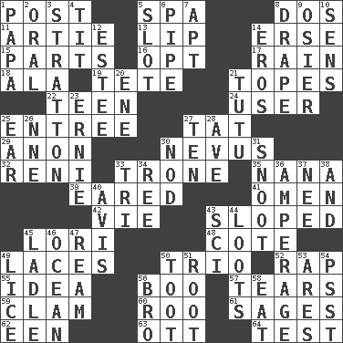 ACROSS 1. Mail 5. Health resort 8. Two (Sp.) 11. Nick name for Arthur 13. Mouth edge 14. Celtic language 15. Components 16. Elect 17. Water falling in drops from the sky 18. Wing 19. False hair 21. Drinks excessively 22. Adolescent 24. One who makes use of a thing 25. Main course 27. Make lace 29. At once, immediately (arch.) 30. Mole, birthmark 32. Painter Guido (1575-1642) 33. Heavy duty weighing machine 35. Grandmother 39. Having ears or earlike features 41. Presage 42. Compete 43. Slanted 45. Australian parrot (variant) 48. ____ d'Azur (French Riviera) 49. Shoestrings 50. Musical group of three 52. Hit sharply and swiftly 55. The content of cognition 56. Surprise greeting 57. Pulls into pieces 59. Dollar (slang) 60. Friend of Pooh 61. Gurus 62. Car or cant ending 63. Baseball player Mel 64. Trial DOWN 1. Dad 2. Taken by mouth 3. Ski resort town in Vermont 4. Teat (slang) 5. Narrow opening 6. Corncob 7. Fitting 8. Window treatment 9. Flexible twig of a willow tree 10. Elected reps. 12. First name in cosmetics 14. Greek god of love 20. Compass dir. 21. Ballerina skirt 23. Bert's buddy 25. Hearing organ 26. Compass dir. 27. "___ Little Indians" 28. "___ Maria" 30. Lower and raise head in agreement 31. Snout, nose 33. Three (prefix) 34. To sift 36. Electrical Measurement 37. Born 38. Also 40. Advice 43. _-fi 44. Plunders 45. Dipping utensil 46. Sea 47. 480, 500 or 516 sheets of paper 49. Louse (plural) 50. A blast of a horn 51. Carrot, for example 53. Ancient Greek god of war 54. Inconspicuous attention getter 56. Sis' sibling 58. Erode