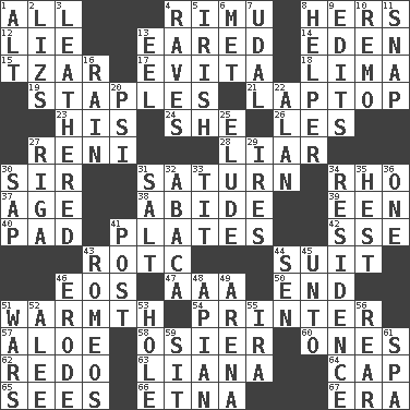 ACROSS 1. 100% 4. Tall New Zealand timber tree 8. Possessive pronoun 12. Whopper 13. Having ears or earlike features 14. Genesis locale 15. Czar 17. Webber/Rice musical 18. Pale green bean 19. Paper fasteners 21. Portable computer 23. Part of HMS, perhaps 24. A female animal or person 26. French article 27. Painter Guido (1575-1642) 28. One who doesn't tell the truth 30. Title for a knight 31. Titan orbits this 34. 17th letter of the Greek alphabet 37. Ripen 38. Remain 39. Car or cant ending 40. Groovy apt. 41. Food holders 42. Compass dir. 43. College mil. group 44. Set of matching outer garments 46. Greek goddess of the dawn 47. American Automobile Association (abbr.) 50. Conclusion 51. Heat 54. Hard copy producer 57. Medicinal plant 58. Flexible twig of a willow tree 60. Washington bills 62. Do over again 63. Climbing, woody, usually tropical vines 64. Head covering 65. Observes 66. Inactive volcano in Sicily 67. Period DOWN 1. Keyboard modifier key 2. Belonging to Elizabeth 3. Resembling or made to resemble leather 4. All-night dance parties 5. From or relating to Ireland 6. Was introduced to 7. Freehold land 8. Assistant 9. Prepares for publication 10. San ____ (Riviera town) 11. Fastener 13. Snakelike fish 16. Water falling in drops from the sky 20. 23rd letter of the Greek alphabet 22. ____ Jay Lerner 25. Dodge 27. Capital of Latvia 29. Angers 30. Plant excrement 31. Table seasoning 32. Phillipine bananalike plant 33. Teat (slang) 34. Home 35. Command 36. Single 41. Mail 43. Lover boys 44. Elected rep. 45. To (old English) 46. Wear away 48. Bee-related 49. Sports stadium 51. Armed conflicts 52. Toward shelter 53. Hollow 55. Lyricist Gershwin 56. Posterior 59. Be seated 61. Health resort