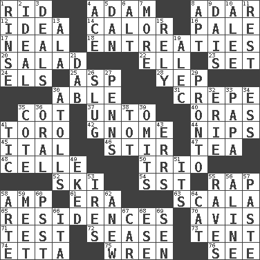 ACROSS 1. To free from 4. First man 8. The sixth month of the Jewish calendar 12. The main thing one is thinking about 14. Bodily heat indicating an inflammation 16. Light colored 17. Be tempered by heat 18. Pleas 20. Vegetable dish 22. Pipe bend 23. Put into a specified state 24. Raised railways 25. Viper 28. Slangy assent 30. Competent 31. Streamer paper 35. Small bed 37. To (old English) 40. Mouths or openings 41. "Corrida" creature 42. Dwarf 44. Pinches, bites 45. Slanted text style (abbr.) 46. Disorderly outburst 47. Afternoon social gathering 48. Cell (Danish) 50. Musical group of three 52. What Jean-Claude Killy likes to do 54. Fast jet (abbr.) 55. Reproach for some lapse or misdeed 58. Electrical Unit 61. Epoch 63. Any of the three canals of the cochlea 65. Dwellings 70. Advice 71. Trial 72. Gospel singer Marvin 73. Portable shelter 74. Singer James 75. Songbird 76. Perceive with the eye DOWN 1. Remove soap 2. Perfect 3. Allots cards 4. Adept person 5. One of the 12 tribes of Israel 6. The first octave above the treble staff 7. Greater amount 8. Fitting 9. Raised platform 10. Toward shelter 11. Repose 13. Chicken ___ king 15. Have trust in 19. Actor Baldwin 21. Small moist lump or mass 26. Snaillike creature with no shell 27. Actor Sean's family 29. Right away 30. Ringlike coral islands and reefs 32. 4th largest of the Great Lakes 33. Dad 34. Curvy letter 35. ____ d'Azur (French Riviera) 36. Spoken 38. Small child 39. Leaves out 41. Nervous spasm 43. Blunders 49. Made supply last 51. ___ a Wonderful Life 53. Angers 55. All-night dance parties 56. Place in a line 57. Thick mixture 58. Johnson of "Laugh-In" 59. Confront 60. Inconspicuous attention getter 62. Afresh 64. Feline 66. Call ___ day 67. Auto 68. Compass dir. 69. Elected rep.