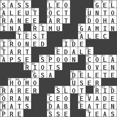 ACROSS 1. Backtalk 5. Lion 8. Set 11. Native American of Southwest Alaska 13. Sep. follower 14. To (old English) 15. The wife of a rajah (variant) 16. Tate display 17. Capital of the state of Qatar 18. _ tizzy (2 wds.) 19. Tall New Zealand timber tree 21. Street urchin 22. Trial 24. Actor Baldwin 25. Pressed 27. Binary compound 29. Small pie 30. Peak District village in England 32. Domed church section 33. Soup utensil 35. Root beer relative 39. Debaucheries 41. Baking chamber 42. Girls' org. (abbr.) 43. Erase 45. Same (prefix) 48. One who makes use of a thing 49. More valued for its uncommonness 50. Slit 52. To free from 55. NW Algerian seaport 56. Corporate head (abbr.) 57. Elude 59. Floor protectors 60. Pat or tap gently 61. Eroded 62. Before (prefix) 63. Compass dir. 64. Beverages made from leaves DOWN 1. Indian skirt 2. ____ Jay Lerner 3. Elected representatives 4. Take to court 5. Rich soil 6. Shade of tan 7. Baseball player Mel 8. Dwarf 9. Value system 10. Grant temporary use of 12. Laconic 14. Freehold land 20. It would 21. Highlander 23. Keyboard key 25. Call ___ day 26. Hit sharply and swiftly 27. Wedding promise 28. One of the 12 tribes of Israel 30. Greek goddess of the dawn 31. Learning spot: Fr. 33. Distress signal 34. Parent Teacher Assoc. 36. Make much ado about nothing 37. Allow 38. A saturated hydrocarbon 40. Russian composer Stravinsky 43. Superhero pair 44. First name in cosmetics 45. Ethiopian city, capital of Harari 46. Declaim 47. Not women's 49. Play 50. Oceans 51. Ear part 53. The main thing one is thinking about 54. Cub Scout units 56. Music discs 58. Large container