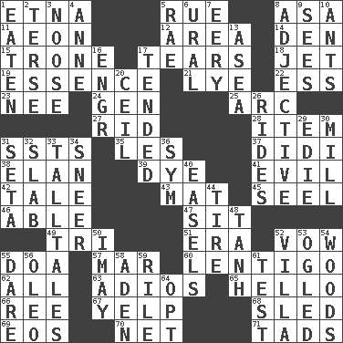 ACROSS 1. Inactive volcano in Sicily 5. Regret 8. White ___ sheet 11. A really long time 12. Type of rug 14. Lair 15. Heavy duty weighing machine 17. Pulls into pieces 18. Passenger plane 19. Substance 21. Potassium hydroxide 22. Double-curved letter 23. Born 24. Commissioned mil. rank 25. Curve 27. To free from 28. A distinct part 31. Fast planes 35. French article 37. "You Light Up My Life" star Conn 38. Liveliness 39. Color 41. Morally bad or wrong 42. Story 43. Floor covering 45. Stitch closed the eyes of (a falcon) 46. Competent 47. Be seated 49. Three (prefix) 51. Period 52. Promise 55. ___ good deed 57. Make imperfect 60. Small, flat, pigmented spot on the skin 62. 100% 63. Goodbye (Sp.) 65. Phone greeting 66. To sift 67. Sharp bark 68. Downhill vehicle 69. Greek goddess of the dawn 70. Fish or hair follower 71. Small boys DOWN 1. Eroded 2. Laconic 3. Trap for birds or small mammals 4. Queen of England 1702-14 5. Actress Charlotte 6. Mountain range 7. Suggestive of the supernatural 8. Descriptive word 9. Observes 10. Pismires 13. Toward the sea 16. Engineer (abbr.) 17. Looked after 20. To provide with a ceiling 26. Amusement-park features 29. Singer Brickell 30. Place where flour is made 31. Stalk of a moss capsule 32. Thick slice 33. Baron Munchausen's specialties 34. Contemptuous expression 36. Symbol (abbr.) 40. Artist's stands 44. Become fatigued 48. Hyperbolic tangent 50. "If ____ say so..." 52. Country estate 53. Stared 54. Forest 55. Have the gumption 56. Butter sub 58. An important port of Yemen 59. Cause heat under the collar 61. Trial 64. Elect