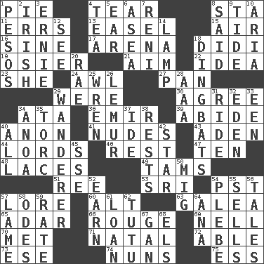 ACROSS 1. Sliced dessert 4. Rend 8. R.R. building 11. Blunders 13. Artist's stand 15. Atmosphere 16. Trig term 17. Sports stadium 18. "You Light Up My Life" star Conn 19. Flexible twig of a willow tree 21. Direct toward a target or goal 22. The main thing one is thinking about 23. A female animal or person 24. Leather borer 27. Baking dish 29. Past tense of be (plural) 30. Match 34. _ moment's notice (2 wds.) 36. Independent ruler or chieftain 39. Tolerate 40. Soon (poet.) 41. Unclothed pictures 43. Arabian gulf 44. Titled peers of a realm 46. Respite 47. Nine, plus one 48. Shoestrings 49. Scottish caps 51. To sift 53. _ Lanka 54. Pacific Standard Time (abbr.) 57. Old wives' tales, e.g. 60. The first octave above the treble staff 63. An organ shaped like a helmet 65. The sixth month of the Jewish calendar 66. Makeup applied to the cheeks 69. 1994 drama film starring Jodie Foster 70. Was introduced to 71. Brizilian seaport 72. Competent 73. Compass dir. 74. Religious women 75. Double-curved letter DOWN 1. Mexican monetary units 2. From or relating to Ireland 3. Bert's buddy 4. Beverage made from leaves 5. Hearing organ 6. Toward the sea 7. Painter Guido (1575-1642) 8. Alleged 9. Periodic rise and fall of the sea level 10. Operatic vocal solo 12. Perceive with the eye 14. Desk light 18. Empty-headed or silly people 20. Actress Charlotte 25. Songbird 26. Arboreal primate 28. Auto club (abbr.) 29. Nomad 31. Travel on an animal 32. Genesis locale 33. Car or cant ending 34. Small Philippine buffalo 35. Torque (variant) 37. Binary compound 38. Musical pauses 40. 100% 42. Play the lead 45. Compass dir. 50. Russian fighter aircraft 52. Merit 54. First-year military academy student 55. Makes a sale 56. Lies 57. Unable to walk 58. Lyric poems 59. Assign a rank or rating to 61. Grant temporary use of 62. Ballerina skirt 64. Santa ___, CA 67. Separate the seeds from cotton 68. Raised railways