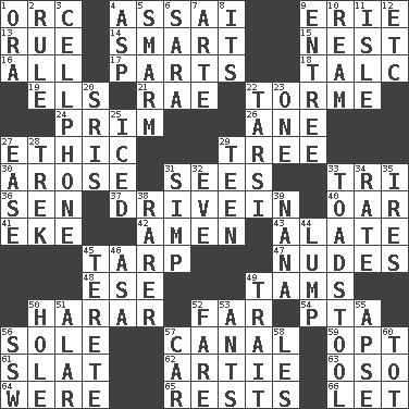 ACROSS 1. The grampus (Milton) 4. Slender Brazilian palm 9. 4th largest of the Great Lakes 13. Sorrow 14. Don Adams' spy role 15. A home for chicks 16. Everything 17. Pieces 18. Baby powder 19. Raised railways 21. Actress Charlotte 22. Singer Mel 24. Demure 26. A saturated hydrocarbon 27. Moral principle 29. Woody plant 30. Came up 31. Observes 33. Three (prefix) 36. Elected rep. 37. Popular '50s hangout 40. Rowing implement 41. Supplement with great effort 42. So be it 43. Having winglike extensions 45. Canvas cover 47. Unclothed pictures 48. Compass dir. 49. Scottish caps 50. Ethiopian city, capital of Harari 52. At a great distance 54. Parent Teacher Assoc. 56. Not divided or shared with others 57. Lessep's creation 59. Choose 61. Narrow board 62. Nick name for Arthur 63. Bear (Spanish) 64. Past tense of be (plural) 65. Musical pauses 66. Allow DOWN 1. Mouth or opening 2. General guideline 3. Portable communications device 4. Viper 5. Excessive but superficial compliments 6. "Two Mules for Sister ____" 7. Johnson of "Laugh-In" 8. ___ a Wonderful Life 9. Main course 10. 480, 500 or 516 sheets of paper 11. Small island 12. And so on (abbr.) 20. Indian titles of respect 22. Tarsus (plural) 23. Single 25. On the rocks 27. Comfort 28. Long journey 29. Adolescent 31. Simple or foolish person 32. First lady 33. Inedible or poisonous agaric 34. Assign a rank or rating to 35. Angers 38. More valued for its uncommonness 39. Nanny 44. Mass 45. Cigar-shaped 46. White ___ sheet 49. Distinguishing feature 50. Opening into or through something 51. Having or resembling wings 52. Conductor's collection 53. Pismires 55. Domed church section 56. Compass dir. 57. Automobile 58. French article 60. Small child