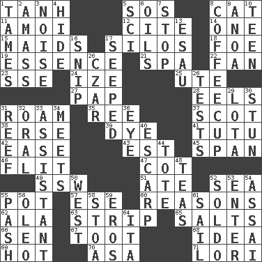 ACROSS 1. Hyperbolic tangent 5. Mayday 8. Domesticated feline 11. Mine, in Marseilles 12. Quote 14. Single 15. Unmarried girls 17. Grain storage towers 18. Enemy 19. Gist 21. Health resort 22. Air blower 23. Compass dir. 24. Ending with capital 25. Shoshoni 27. Infant food 28. Snakelike fish 31. Wander 35. To separate or throw off 37. Highlander 38. Celtic language 39. Color 41. Ballerina skirt 42. Relaxation 43. Eastern Standard Time (abbr.) 45. Connect, as a bridge 46. Secret move to avoid paying debts 47. Small bed 49. Compass dir. 51. Had dinner 52. Ocean 55. Plant holder 57. Compass dir. 60. Thinks logically 62. Chicken ___ king 63. Remove all contents or possession from 65. Table seasonings 66. Elected rep. 67. A blast of a horn 68. The content of cognition 69. Being at a high temperature 70. White ___ sheet 71. Australian parrot (variant) DOWN 1. Domesticates 2. Collect or gather 3. Annoying sound 4. Flintstone garb 5. _-fi 6. Lubricates 7. Discontinue 8. Java holder (2 wds.) 9. Small Philippine buffalo 10. Adolescent 13. Son of Isaac 16. Clip 17. Oozed 20. Russian ruler of old 26. Trials 29. Globular water bottle used in Asia 30. Astound 31. Coral collection 32. Of the mouth 33. Aide 34. Confronts 36. Sight organ 40. Fortification 44. Carryall 48. Beverages made from leaves 50. Compass direction 52. Twentieth part of a lira 53. Keyboard key 54. Slender Brazilian palm 55. Romantic infatuation 56. Margarine 58. Portico 59. Greek god of love 61. Move on water 64. Call ___ day