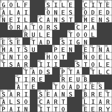 ACROSS 1. _ course 5. Filth; sediment 9. Quote 13. Jai _ 14. Washington bills 15. Wrote a lyric poem 16. Famous astronaut Armstrong 17. 2nd pers. sing. pres. of can (arch.) 18. Not women's 19. Speakers 21. Tax preparer (abbr.) 22. General guideline 23. Utensil 24. Compass dir. 27. Bit 28. Signal 29. Taiwanese island in East China Sea 31. Animal enclosure 32. Inactive volcano in Sicily 36. To the inside or interior of 37. Being at a high temperature 38. Christmas carol 39. Russian ruler of old 40. One more than two 41. Took without asking 42. Bits 44. Parent Teacher Assoc. 46. Affectionate concern, for short 47. Become fatigued 48. Reuben's nickname 50. Had dinner 51. Sycophants 54. Indian skirt 56. Actors Connery and Penn 58. Cy Young winner Saberhagen 60. In addition 61. Haul 62. One who doesn't tell the truth 63. Ache 64. "Tell ____ the Marines!" 65. Suggestive of the supernatural DOWN 1. Separate the seeds from cotton 2. Margarine 3. Den 4. Having threads 5. Flew 6. Lodging establishments 7. French article 8. Eastern Standard Time (abbr.) 9. Part 10. Perfect 11. "___ Little Indians" 12. Begley and Asner 17. Root beer relative 20. Ballerina skirt 21. Gear tooth 23. Metal container 24. Send forth 25. Without 26. Singer James 28. Put into a specified state 30. Determination 31. Luau course 33. A blast of a horn 34. 1994 drama film starring Jodie Foster 35. Actor Baldwin 37. Part of HMS, perhaps 40. Binary compound 41. Saudi Arabian king (1953-1964) 43. "We ___ not amused" (Victoria) 44. Right away 45. Beverages made from leaves 47. Tarsus (plural) 49. The Good Book 51. Small pie 52. 4th largest of the Great Lakes 53. Burn superficially 54. Plant excrement 55. According to 56. _-fi 57. Consume 59. Attempt