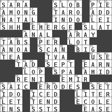 ACROSS 1. "Two Mules for Sister ____" 5. Messy guy 9. Sliced dessert 12. Amid 14. Pacific island yam 15. Say or write further 16. Relating to or accompanying birth 17. Southeast Asian peninsula 18. Flowery wreath 19. Quiet! 20. Develop 23. Narrow board 24. Of or related to the anus 25. Like ___ of sunshine 27. Bar bills 30. For each 32. Car dealer's back yard 33. Small Philippine buffalo 34. Glance over 36. Of large size 38. Beverage made from leaves 39. Federal power corp. 40. Purpose 43. Small boy 46. Back-to-school mo. 48. Merit 49. Trim (branches) 51. Health resort 52. Among 53. Painter Guido (1575-1642) 54. Arab leader 56. Ketch in the Levant 58. Eats (away) 61. Arrange properly for use 64. Wedding promise 65. On the rocks 66. 61 cubic inches 68. Allow 69. Watch over 70. Learning spot: Fr. 71. Followers of ems 72. Fast planes 73. Relaxation DOWN 1. Without 2. Nanny 3. Writer of Portnoy's Complaint (1969) 4. Santa ___, CA 5. Move through with a circular motion 6. Long (Scottish) 7. Severe or trying experience 8. Sometimes accompanies a hiss 9. Chummy 10. The main thing one is thinking about 11. Prepare for publication 13. Small, secluded valley 21. Atlas contents 22. Opts 23. Suttee (variant) 24. White ___ sheet 26. Director Reiner 27. Make lace 28. A saturated hydrocarbon 29. Water vessel 31. All-night dance parties 35. Slept 37. Island territory of the United States 41. Indian title of respect (Mr.) 42. Conclusion 44. Actor Baldwin 45. Spanish title 47. Docile 48. Hearing organ 50. Components 53. Debaucheries 55. Small island 56. Drop; flow; fall 57. Arabian gulf 59. Monthly bill 60. Likelihood 61. Portico 62. Snakelike fish 63. Relationship diagram 65. It is 67. Frozen water