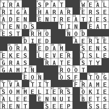 ACROSS 1. Retirement account (abbr.) 4. Petty quarrel 8. Welt 12. Port city in Latvia 14. Ethiopian city, capital of Harari 16. Celtic language 17. An important port of Yemen 18. Pleas 20. Is inclined (to) 22. Metal container 23. Erode 24. Eastern Standard Time (abbr.) 25. 17th letter of the Greek alphabet 28. Allow head to fall sleepily 30. Passed on 31. Nest on high 35. Mouth or opening 37. Dutch treat 40. Elected reps. 41. Makes supply last 42. Prying instrument 44. Capri or Wight 45. Pate de foie ____ 46. Assign a rank or rating to 47. Filthy place 48. Homeless child 50. Carrot, for example 52. A really long time 54. Order of Saint Francis (abbr.) 55. Coat; cloak 58. Federal power corp. 61. Teat (slang) 63. Movie unit 65. Wine waiters 70. Migrant worker of the '30s 71. Toward shelter 72. World-weariness 73. Wagers 74. Monthly bill 75. Ooze 76. Compass dir. DOWN 1. Feeling or showing extreme anger 2. Amusement-park features 3. Representative 4. A female animal or person 5. Baking dish 6. Tate display 7. Small pie 8. Soggy 9. 4th largest of the Great Lakes 10. At sea 11. For fear that 13. Also 15. It's straight from the horse's mouth 19. Small Philippine buffalo 21. _ Lanka 26. Person who is morally reprehensible 27. More peculiar 29. Cease 30. Hyrax 32. Remainder 33. Inwardly 34. Compass dir. 35. Gumbo ingredient 36. 480, 500 or 516 sheets of paper 38. Actress Gardner 39. Paris' subway 41. Ovum 43. Vintage cars 49. Make mention of 51. Below a satisfactory level 53. Mediterranean tributary 55. Receives possession of 56. Leaves out 57. Honkers 58. Russian ruler of old 59. Short-tailed, large-bodied rat 60. So be it 62. Airtight sealed metal containers 64. Director Reiner 66. Was introduced to 67. Compass dir. 68. Regret 69. Small drink