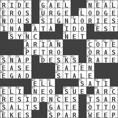 ACROSS 1. Travel on or in a vehicle 5. Highlander 9. Anneal 13. Greek god of love 14. Goad 15. Inn 16. Common sense 17. Seigniories (variant) 19. _ tizzy (2 wds.) 20. "One Day ___ Time" 21. Wedding promise 22. Eastern Standard Time (abbr.) 23. Synchronize (abbr.) 25. Remaining after all deductions 26. Believer in; advocate of (suffix) 30. ____ d'Azur (French Riviera) 34. Stone: prefix 35. Mouths or openings 36. Fastener 39. Writing tables 42. Pace 43. Relaxation 44. Consumed 46. Mild oath 47. Showing deterioration from age 48. Pipe bend 51. Suttee (variant) 54. Biblical high priest 57. Modern: prefix 58. Institute legal proceedings 60. Curve 62. Dwellings 65. Russian ruler of old 66. Table seasonings 67. Yard entry 68. Von Bismarck 69. Makes supply last 70. Coast Guard woman 71. Shed a tear DOWN 1. Painter Guido (1575-1642) 2. Metal shackles 3. A city in N France, SE of Calais 4. Curvy letter 5. Abrupt rush of wind 6. Roberta Peters solo 7. Oval reproductive body of a fowl 8. Soviet premier 1918-24 9. And not 10. Singer Brickell 11. Grows older 12. For fear that 15. Plunder 18. Binary compound 20. Measure of real estate 24. Slept 27. It would 28. "We ___ not amused" (Victoria) 29. Olfactory organs 30. Pupil covering 31. Mouth or opening 32. Make lace 33. Compass dir. 36. Observe 37. Tired old horse 38. White ___ sheet 40. Krazy ___ of comics 41. R.R. building 45. Otherwise 48. Conclusions 49. Area sheltered from the wind 50. Yearns 52. Clothes sense 53. Feeling or showing extreme anger 54. Celtic language 55. Path through which fluid escapes 56. Capri or Wight 58. Stalk of a moss capsule 59. One who uses or employs something 61. Riding implement 63. It is 64. Head covering 65. Pull behind
