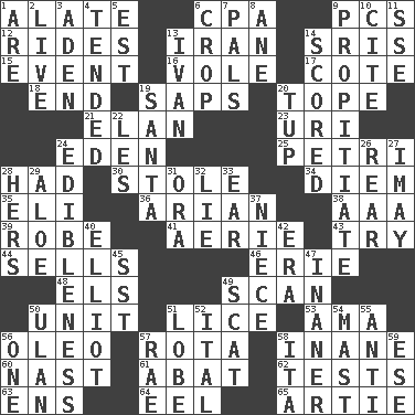 ACROSS 1. Having winglike extensions 6. Tax preparer (abbr.) 9. Personal Computers (abbr.) 12. Amusement-park features 13. SW Asia republic 14. Indian titles of respect 15. Happening 16. Grand slam 17. ____ d'Azur (French Riviera) 18. Conclude 19. Plant excrements 20. Drink excessively 21. Liveliness 23. RI univ. 24. Paradise 25. _ dish (used to culture cells) 28. Possessed 30. Fur scarf 34. South Vietnam president (1954) 35. Biblical high priest 36. Believer in; advocate of (suffix) 38. American Automobile Association (abbr.) 39. Loose flowing garment 41. Nest on high 43. Attempt to accomplish something 44. Exchanges for money 46. One of the Great Lakes 48. Raised railways 49. Examine hastily 50. A single undivided whole 51. Louse (plural) 53. Nanny (var.) 56. Margarine 57. Round or rotation of duties 58. Silly 60. Political cartoonist Thomas 61. Blind as ____ 62. Trials 63. Followers of ems 64. Snakelike fish 65. Nick name for Arthur DOWN 1. "We ___ not amused" (Victoria) 2. Not recorded 3. An important port of Yemen 4. Looked after 5. Eastern Standard Time (abbr.) 6. Riding implement 7. Friends 8. A saturated hydrocarbon 9. Conciliate 10. Quote 11. Compass dir. 13. "Terrible" tsar 14. Tallied 19. Before Barbara or Clara 20. Uncastrated adult male sheep 22. French article 24. The property of being fit to eat 26. Tail end 27. "If ____ say so..." 28. Possessive pronoun 29. _ vera 31. Mouth or opening 32. Whopper 33. Hearing organ 37. Sibling's daughter 40. American author Paul (1891-1958) 42. Epoch 45. Fast jet (abbr.) 47. More empty; more void 49. Go away! 50. Uhlan (variant) 51. Ear part 52. Slanted text style (abbr.) 54. Vertical spar for supporting sails 55. Opposed to 56. Single 57. Actress Charlotte 58. Call ___ day 59. Compass dir.