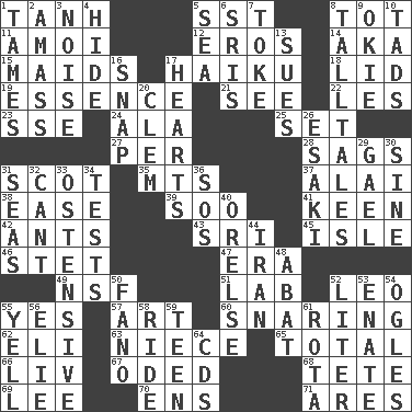 ACROSS 1. Hyperbolic tangent 5. Fast jet (abbr.) 8. Small child 11. Mine, in Marseilles 12. Greek god of love 14. Alias (abbr.) 15. Women servants 17. Japanese poetic form 18. Hat (slang) 19. Core 21. Observe 22. French article 23. Compass dir. 24. Wing 25. Put into a specified state 27. For each 28. Sinks 31. Highlander 35. Mountains (abbr.) 37. Mountain range southwest of Kyrgyzstan 38. Comfort 39. "Barney Miller" actor Jack 41. Peachy ____! 42. Pismires 43. Indian title of respect (Mr.) 45. Small island 46. Proofreading order 47. Period 49. Overdraft (abbr.) 51. Experiment locale 52. Lion 55. It is so 57. Nonscientific branch of learning 60. Catching in a trap 62. Biblical high priest 63. Sibling's daughter 65. "_____ Recall" 66. 54 in ancient Rome 67. Wrote a lyric poem 68. Wig 69. Area sheltered from the wind 70. Followers of ems 71. Ancient Greek god of war DOWN 1. Softens 2. Collect or gather 3. Annoying sound 4. Flintstone garb 5. Ocean 6. Indian titles of respect 7. Puff or smoke 8. Baron Munchausen's specialties 9. Migrant worker of the '30s 10. Bits 13. Institutes legal proceedings 16. Fastener 17. Centers 20. To starve (Brit.) 26. 1973 Nobel Price Winner (Physics) Leo 29. Highlander 30. Trig term 31. Oceans 32. Patter 33. Clearly or manifestly demonstrative 34. Trials 36. Mayday 40. Threatening words 44. SW Asia republic 48. Blind as ____ 50. Papal veil 52. 61 cubic inches 53. Maternal 54. Stares 55. Shout 56. Writer Wiesel 58. Travel on an animal 59. Adolescent 61. Roll call or roster of names 64. Music discs