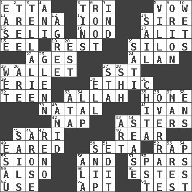 ACROSS 1. Singer James 5. Three (prefix) 8. Solemn pledge 11. Sports stadium 13. Electrically charged atom 14. Male parent of an animal 15. Former Milwaukee Brewers owner Bud 16. Dreamland 17. Came down and settled, as after flight 18. Snakelike fish 19. Remainder 21. Grain storage towers 22. Eras 24. Actor Alda or Thicke 25. Place for singles 27. Fast jet (abbr.) 29. One of the Great Lakes 30. Moral principle 32. Adolescent 33. Assad's deity 35. Dwelling 39. Brizilian seaport 41. "Terrible" tsar 42. Atlas unit 43. Michaelmas daisies 45. Indian skirt 48. Posterior 49. Having ears or earlike features 50. Stalk of a moss capsule 52. Strike 55. The Jewish people; Israel 56. Added to 57. Practice fights 59. In addition 60. Cards in a Roman deck? 61. _____ Park, CO 62. Purpose 63. Fitting 64. Trial DOWN 1. Comfort 2. Family _ (genealogy) 3. Copy Pinocchio 4. Black tropical American cuckoo 5. Airtight sealed metal containers 6. Carrot, for example 7. Working for oneself (abbr.) 8. Country residence 9. Constellation of myth 10. Moistens 12. Match 14. Move on water 20. Eastern Standard Time (abbr.) 21. Suttee (variant) 23. American astronaut and politician John 25. Soggy 26. "We ___ not amused" (Victoria) 27. R.R. building 28. Quiet! 30. Pipe bend 31. Riviera of "Kiss of the Spider Woman" 33. "One Day ___ Time" 34. Pet locale 36. Make much ado about nothing 37. Spoil 38. Followers of ems 40. Among 43. Nonscientific branch of learning 44. Gospel singer Marvin 45. Travels by water 46. Came up 47. Former U.S. Attorney General Janet 49. He sold his birthright 50. Clip 51. Prepare for publication 53. Ancient Greek god of war 54. Inconspicuous attention getter 56. Insect wing 58. Pacific Standard Time (abbr.)