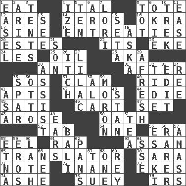 ACROSS 1. Erode 4. Slanted text style (abbr.) 8. Lug 12. Ancient Greek god of war 14. Nothings 16. Gumbo ingredient 17. Trig term 18. Pleas 20. _____ Park, CO 22. ___ a Wonderful Life 23. Make supply last 24. French article 25. Petroleum 28. Alias (abbr.) 30. Against 31. Following 35. Mayday 37. Dollar (slang) 40. Travel on or in a vehicle 41. Flats, for short 42. Saint headwear 44. Singer Brickell 45. Suttee (variant) 46. Heavy open wagon 47. Put into a specified state 48. Came up 50. Pledge 52. Keyboard key 54. Compass dir. 55. Epoch 58. Snakelike fish 61. Hit sharply and swiftly 63. Indian state 65. Interpreter 70. "Two Mules for Sister ____" 71. Make mention of 72. Empty; void 73. Supplements with great effort 74. American tennis player Robert 75. Chop _ 76. Big collection agency DOWN 1. Artist's stand 2. Originate 3. Portable shelters 4. Ending with capital 5. "___ Little Indians" 6. Tate display 7. Australian parrot (variant) 8. Small child 9. Migrant worker of the '30s 10. Long journey 11. Relaxation 13. Observe 15. Stalk of a moss capsule 19. "____ silly question..." 21. Manchild 26. Hankering 27. Pale purple color 29. Anew 30. Help 32. Periodic rise and fall of the sea level 33. Prepare for publication 34. To sift 35. Practice fight 36. "Beetle Bailey" pooch 38. According to 39. Person of subnormal intelligence 41. White ___ sheet 43. Comedian Laurel of Laurel & Hardy 49. Hearing organs 51. Beverage made from leaves 53. Indonesian resort city 55. 1973 Nobel Price Winner (Physics) Leo 56. Less widely known 57. Collect or gather 58. Inactive volcano in Sicily 59. Greek god of love 60. Thin strip of wood or metal 62. Zero-star reviews 64. Compass dir. 66. Born 67. The 19th letter of the Greek alphabet 68. Single 69. Marina Del _, California