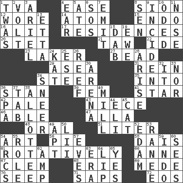 ACROSS 1. Federal power corp. 4. Comfort 8. The Jewish people; Israel 12. Had on 14. Tiny particle 15. Inside; within (prefix) 16. Set down 17. Homes 20. Proofreading order 21. The 23rd letter of the Hebrew alphabet 22. Binary compound 23. Member of a famous L.A. basketball team 27. Necklace unit 29. At sea 31. It's straight from the horse's mouth 34. Guide 35. To the inside or interior of 36. Comedian Laurel of Laurel & Hardy 39. Opposite of masc. 41. Play the lead 42. Diluted with white 43. Sibling's daughter 46. Competent 47. Silent film actress Nazimova 48. Relating to the mouth 51. 61 cubic inches 54. Nonscientific branch of learning 56. Sliced dessert 58. Raised platform 61. Rotating or pertaining to rotation 66. Singer Murray 67. To starve (Brit.) 68. 4th largest of the Great Lakes 69. Ancient Persian 70. Ooze 71. Plant excrements 72. Greek goddess of the dawn DOWN 1. It was, poetically 2. Electrical Unit 3. Satellite of Uranus 4. Ewer handle 5. Had dinner 6. Mayday 7. Give off 8. Elected rep. 9. Event 10. Wrote a lyric poem 11. Characteristic smell of wine 13. Singer James 18. Apply (a substance) by light strokes 19. She-sheep 24. Krazy ___ of comics 25. Compass dir. 26. Coral ridge 28. Originate 30. Sports stadium 32. Call ___ day 33. And not 34. Scornful expression 36. Health resort 37. Bar bill 38. One to whom something is allotted 40. Place where flour is made 44. Biblical high priest 45. Feline 49. Fitting 50. Cards in a Roman deck? 52. Dutch treat 53. The wife of a rajah (variant) 54. Curves 55. Hero or heavy, e.g. 57. Nights before holidays 59. _ china 60. Observes 62. Electrical Unit 63. Period 64. Mouth edge 65. It is so