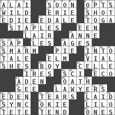 ACROSS 1. Jai _ 5. Within a short period 9. Elects 13. Rampant 14. One of the Great Lakes 15. Guess 16. Singer Brickell 17. Peak District village in England 18. Ancient Roman robe 19. Paper fasteners 21. Car or cant ending 22. Den 23. Queen of England 1702-14 24. Plant excrement 27. French article 28. Grows older 29. Excessive but superficial compliments 31. Sliced dessert 32. To the inside or interior of 36. Lie 37. Shade tree 38. Small bottle 39. "______ My Girl" (Turtles hit) 40. Male child 41. Cell (Danish) 42. Angers 44. _-fi 46. Environmental prefix 47. Arabian gulf 48. Pledge 50. Turn to the right 51. Those who practice law 54. Locale of original sin 56. Rends 58. Put down 60. Synchronize (abbr.) 61. Migrant worker of the '30s 62. _ and Stitch 63. False hair 64. Look after 65. Singles DOWN 1. Deep reverence 2. Flaplike coverings 3. Set down 4. Perfect 5. Spring feasts 6. Mouths or openings 7. Petroleum 8. Born 9. Clearly or manifestly demonstrative 10. Give a jingle 11. Coat; cloak 12. R.R. building 17. Writer Wiesel 20. Inside of hand 21. Compass dir. 23. Mature 24. Fast planes 25. Wet nurse 26. Light colored 28. Direct toward a target or goal 30. Dwelling 31. Apply oneself diligently 33. "Death on the ____" 34. Baby powder 35. Butter sub 37. Greek goddess of the dawn 40. Benjamin's nick name 41. Municipality 43. Portuguese money of account (variant) 44. Flew 45. Crow sounds 47. Representative 49. Phone greeting 51. (Had) reclined 52. Precipitation 53. Drop; flow; fall 54. Eastern Standard Time (abbr.) 55. Color 56. Small child 57. Make supply last 59. Two (Sp.)