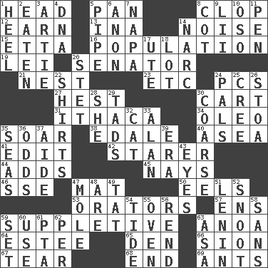 ACROSS 1. Froth on beer 5. Baking dish 8. Hoof sound 12. Merit 13. _ tizzy (2 wds.) 14. Annoying sound 15. Singer James 16. Census information 19. Flowery wreath 20. Elected representative 21. A home for chicks 23. And so on (abbr.) 24. Personal Computers (abbr.) 27. Command 30. Heavy open wagon 31. New York city 34. Margarine 35. Fly high 38. Peak District village in England 40. Toward the sea 41. Prepare for publication 42. A viewer who gazes fixedly 44. Sums up 45. Negative votes 46. Compass dir. 47. Floor covering 50. Snakelike fish 53. Speakers 57. Followers of ems 59. Supplementary 63. Small Philippine buffalo 64. First name in cosmetics 65. Lair 66. The Jewish people; Israel 67. Rend 68. Conclude 69. Pismires DOWN 1. Person who is morally reprehensible 2. Ingested 3. Nick name for Arthur 4. Heredity factor (abbr.) 5. Corncob 6. At once, immediately (arch.) 7. California wine valley 8. Small bed 9. Cards in a Roman deck? 10. Bear (Spanish) 11. Writing instrument 14. Drug cop 17. Shoshoni 18. Car dealer's back yard 20. Proofreading order 22. Chest coverings 24. Friends 25. Algonquian 26. Portico 28. A female animal or person 29. Small amounts or degrees 30. Unrefined 32. Feline 33. ____ Jay Lerner 35. Oceans 36. Probability 37. Helper 39. Epoch 43. Snake ____ (dice throw) 47. Undercover agent 48. "We ___ not amused" (Victoria) 49. Make lace 51. Soviet premier 1918-24 52. Snout, nose 54. Periodic rise and fall of the sea level 55. Baking chamber 56. Tear apart 58. Without 59. Put into a specified state 60. Purpose 61. Parent Teacher Association (abbr.) 62. For each 63. White ___ sheet